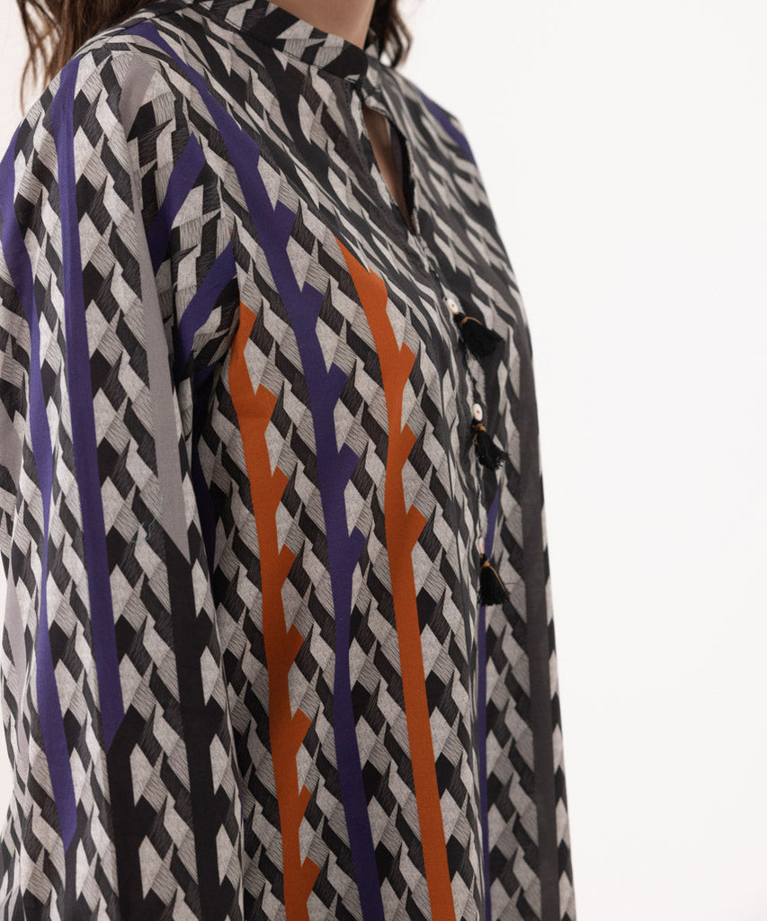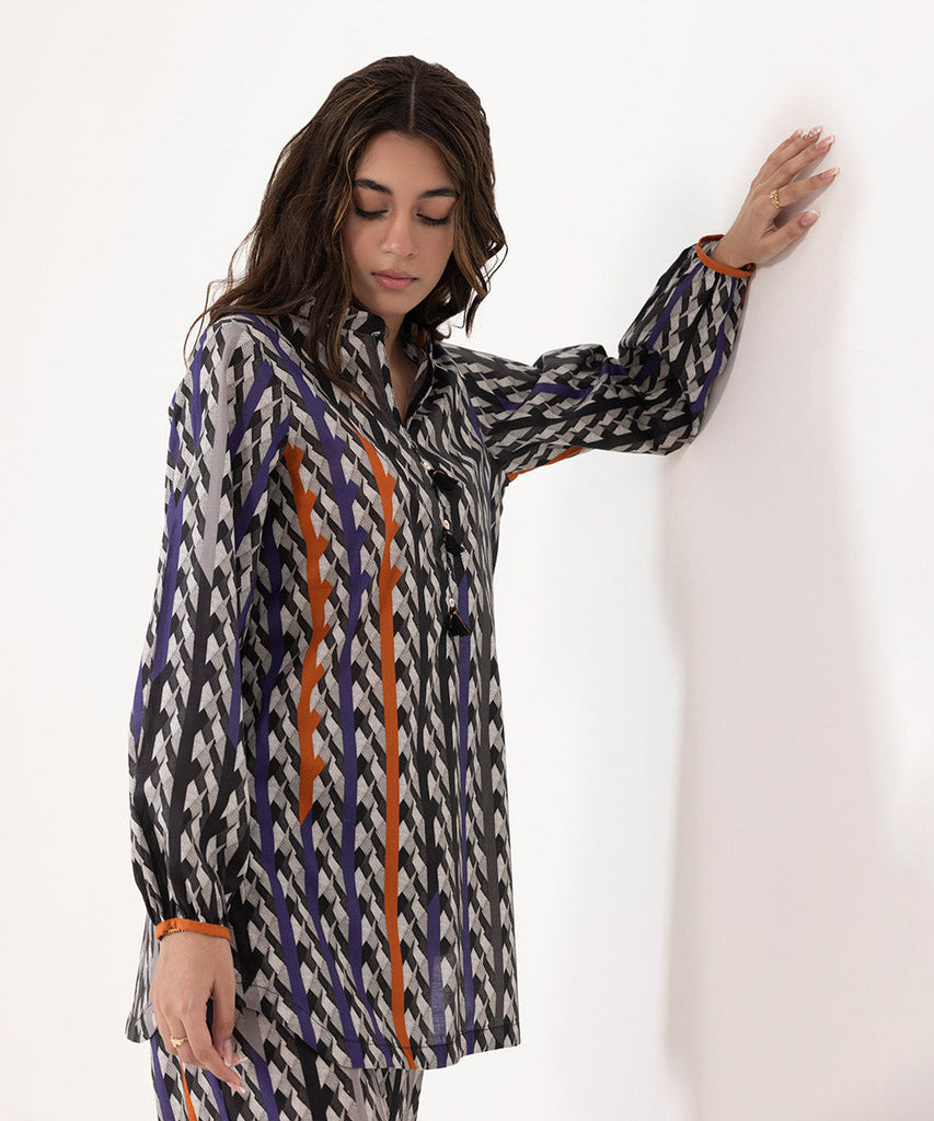 A perfect blend of comfort and style- our specially developed lawn fabric with stretch in a button down silhouette accented with buttons paired with printed straight pants.