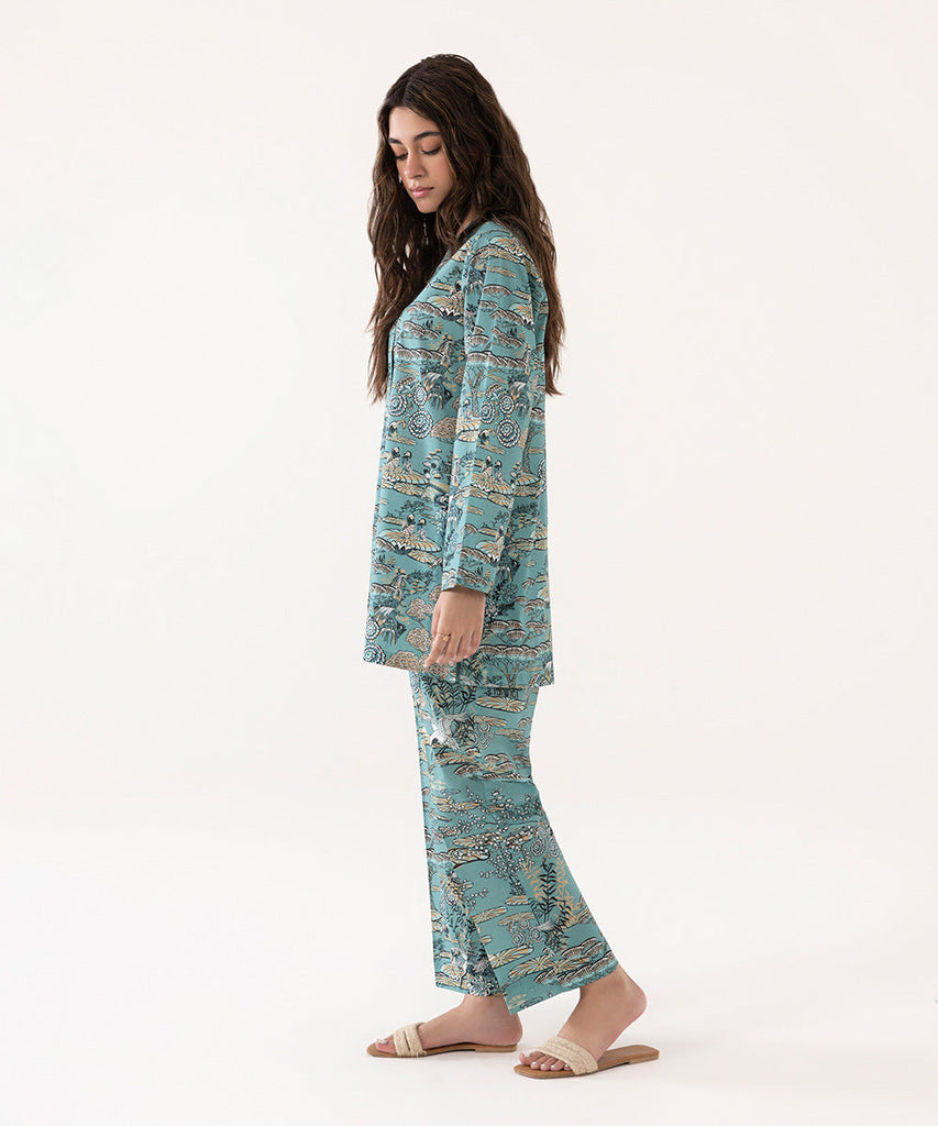 A perfect blend of comfort and style- our specially developed lawn fabric with stretch in a button down silhouette accented with buttons paired with printed straight pants.