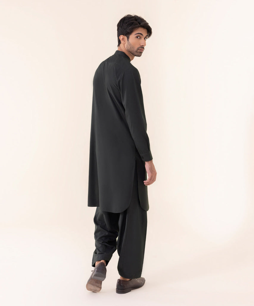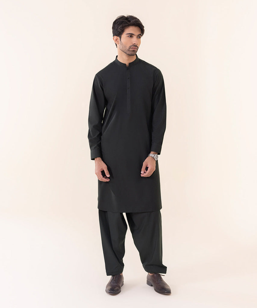 Upgrade your summer wardrobe with our dark grey kurta shalwar in wash & wear featuring detailing on placket and cuffs.