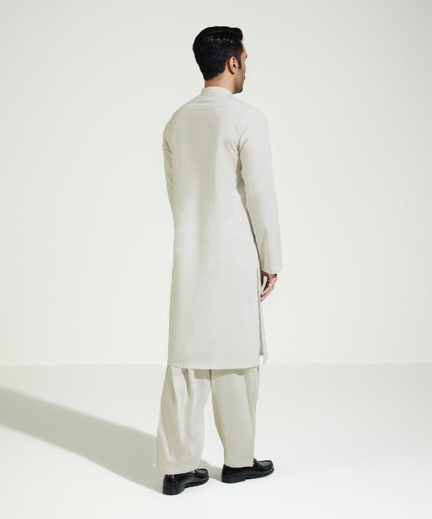 This Eid, stun in our off white kurta featuring a band neckline paired with a shalwar.