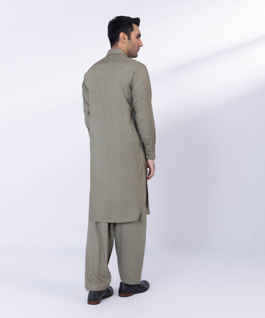 Make a dapper statement in our brown wash & wear two-piece suit featuring straight kurta with detailing & shalwar.