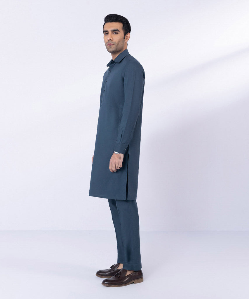 Uplift your style with our blue fine cotton two-piece suit featuring straight kurta & trouser.