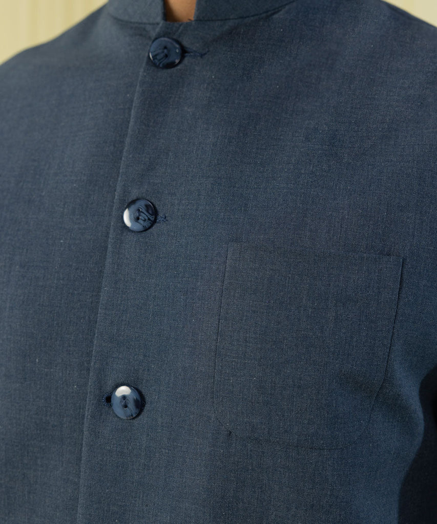 For a crisp appearance don this dark blue mélange waistcoat with patch pockets.
