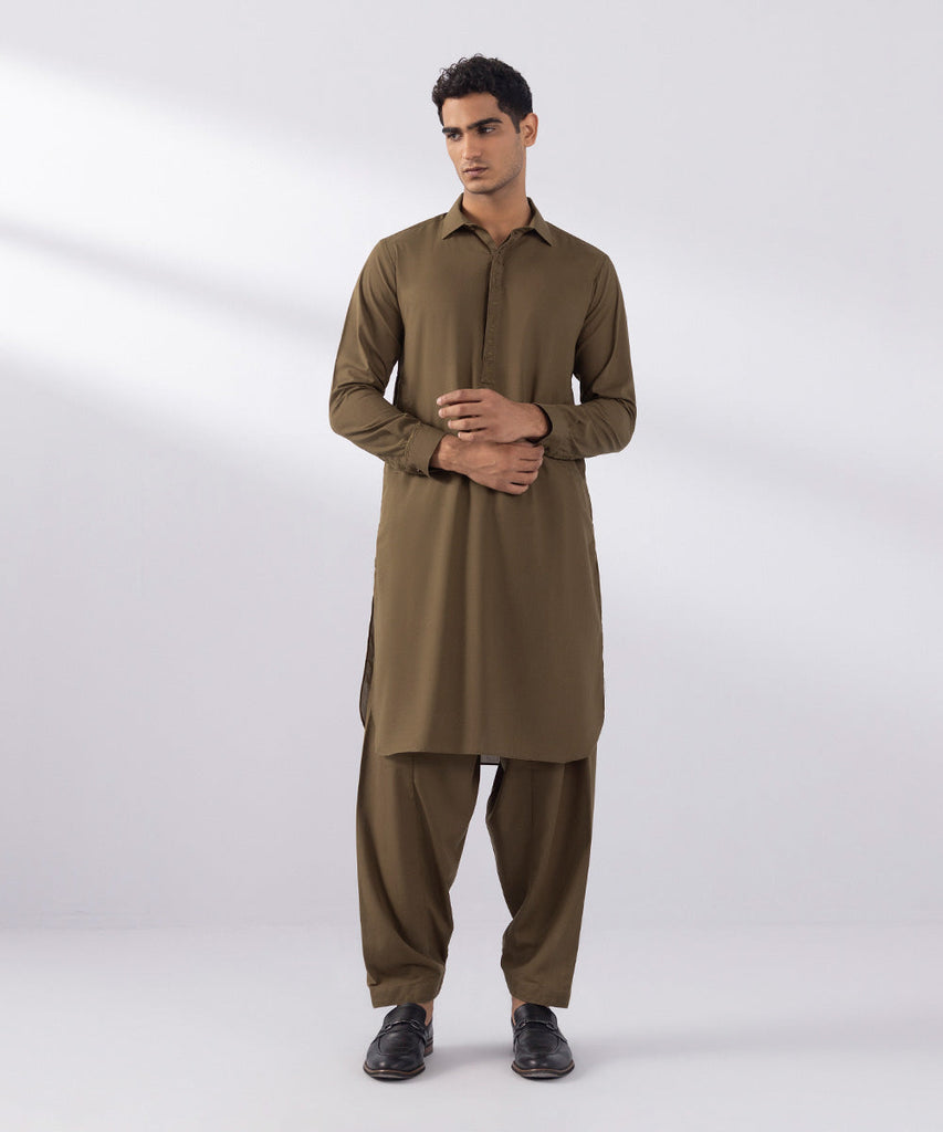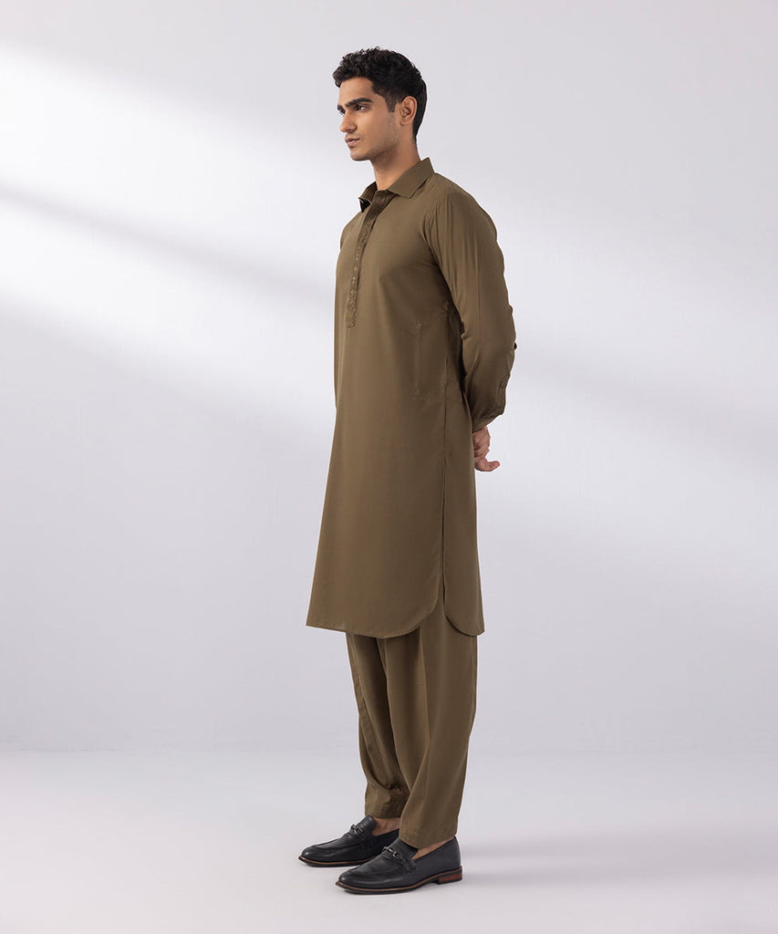 Opt for a critical Eid look in our brown wash & wear straight kurta paired with shalwar, featuring embroidery.