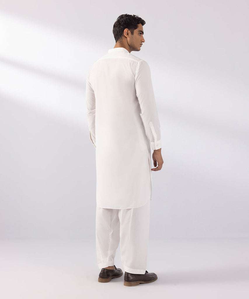 Keep it easy breezy this festive season in our white wash & wear round hem kurta paired with shalwar, featuring embroidery.