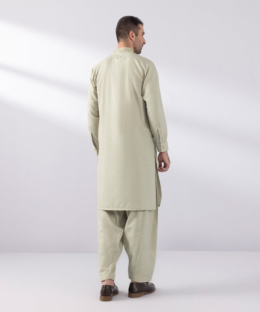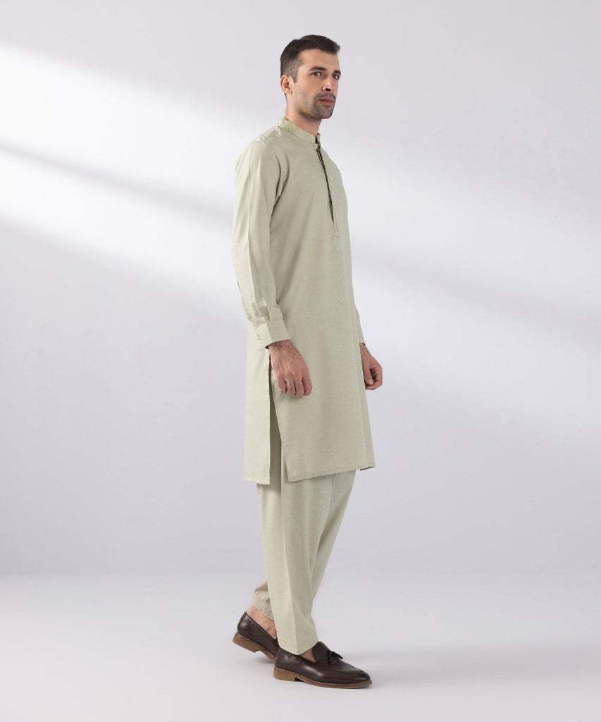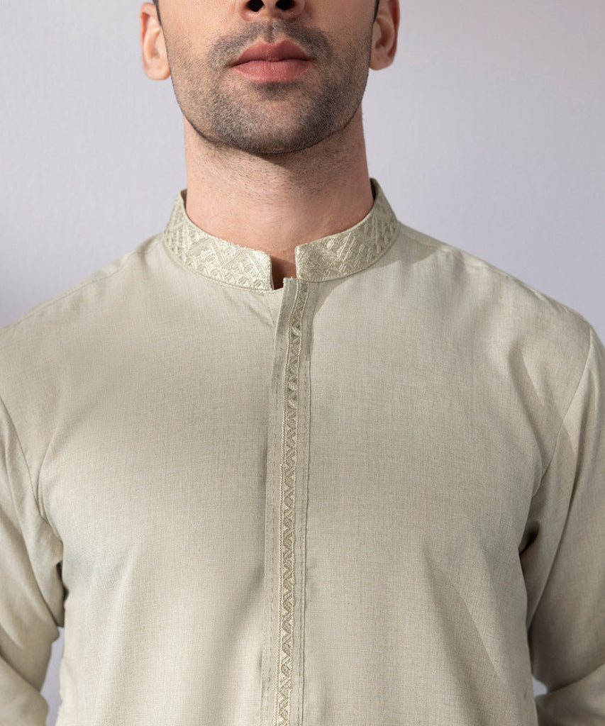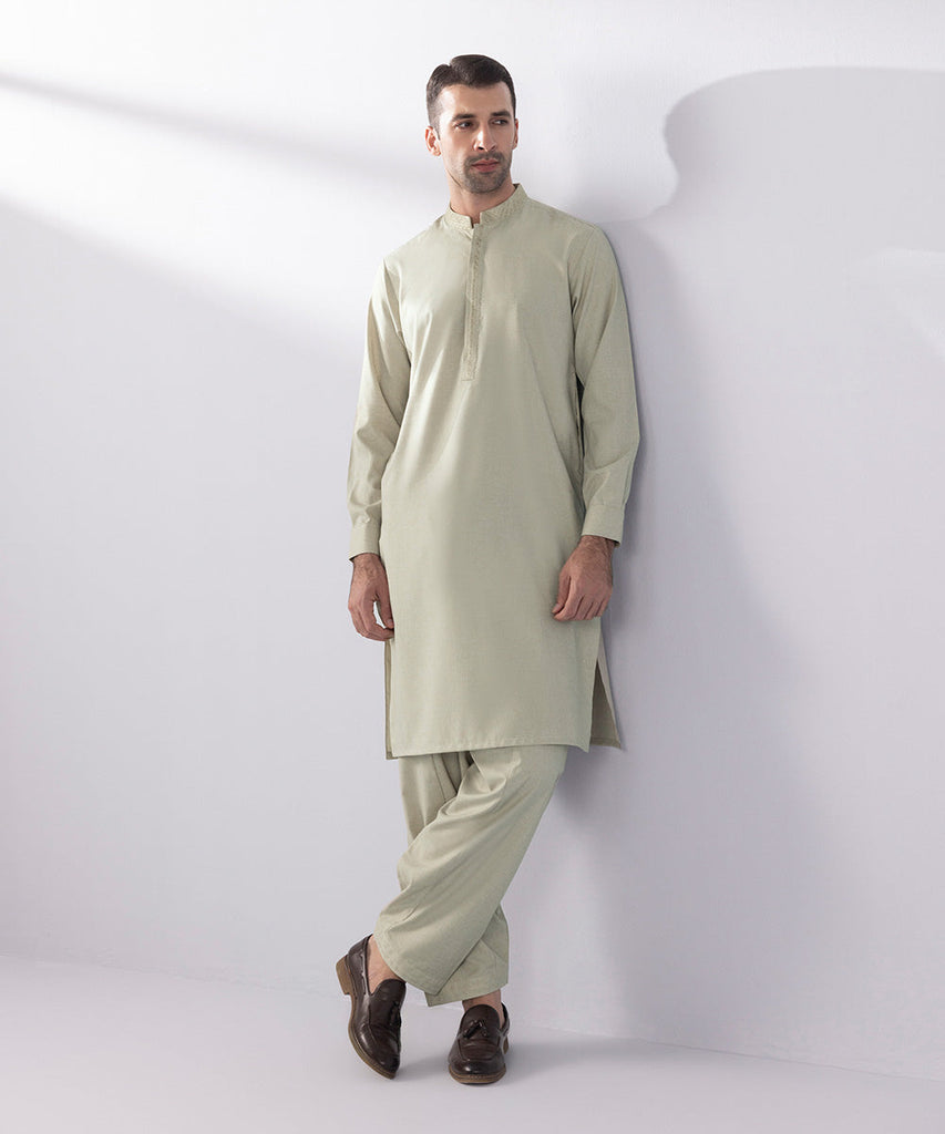 Create a classy look in our coffee cream fancy wash & wear straight kurta paired with shalwar, featuring embroidery.