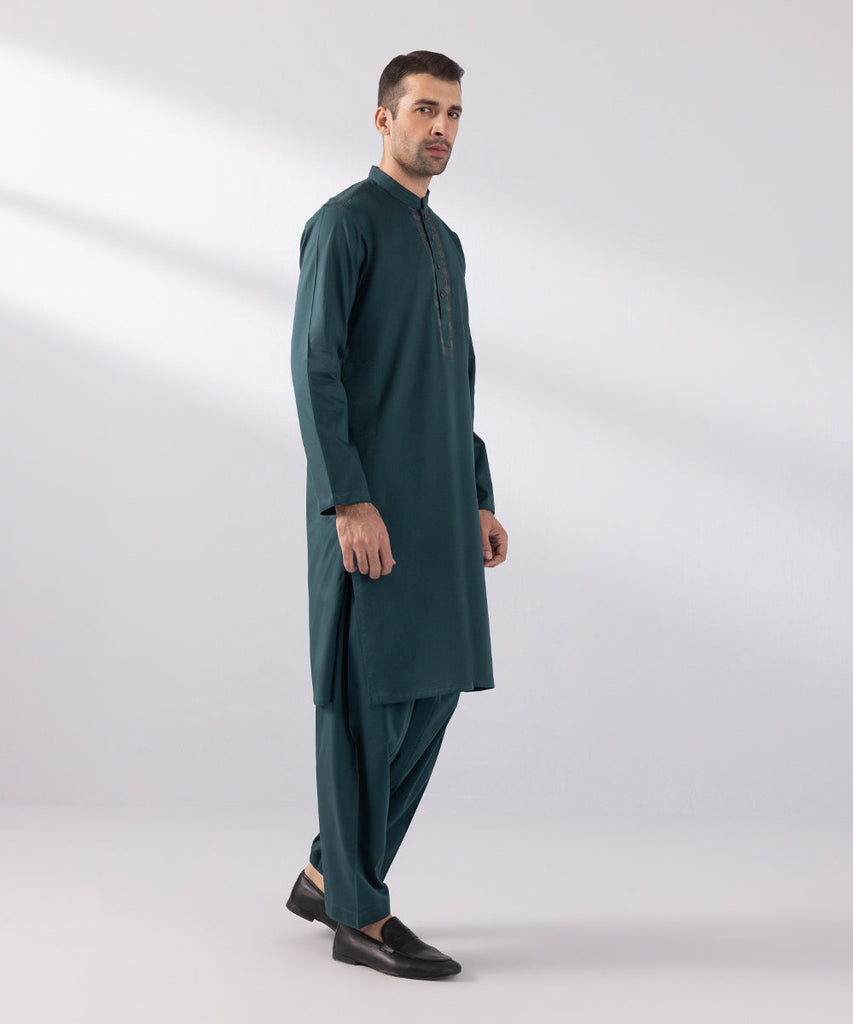 Elevate your everyday style in our dark green embroidered cotton dobby straight kurta and shalwar.