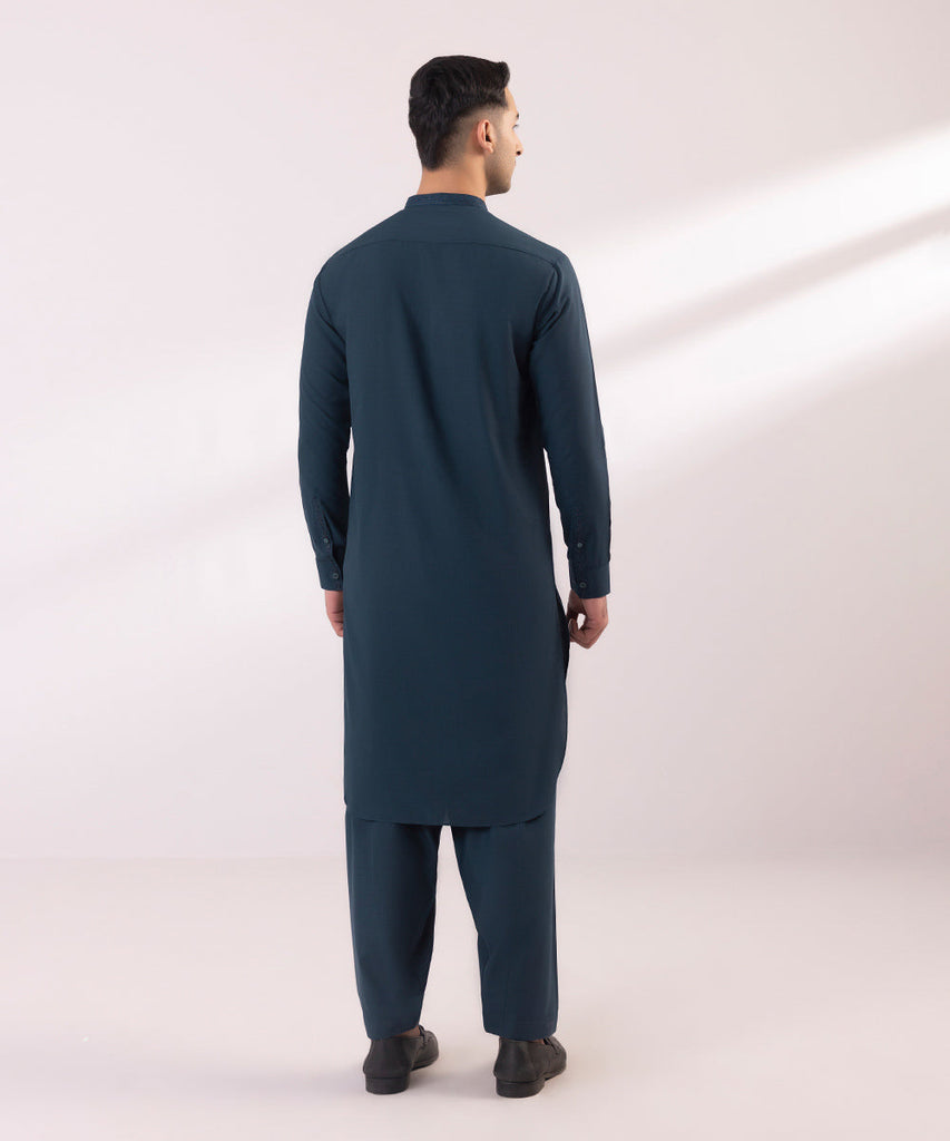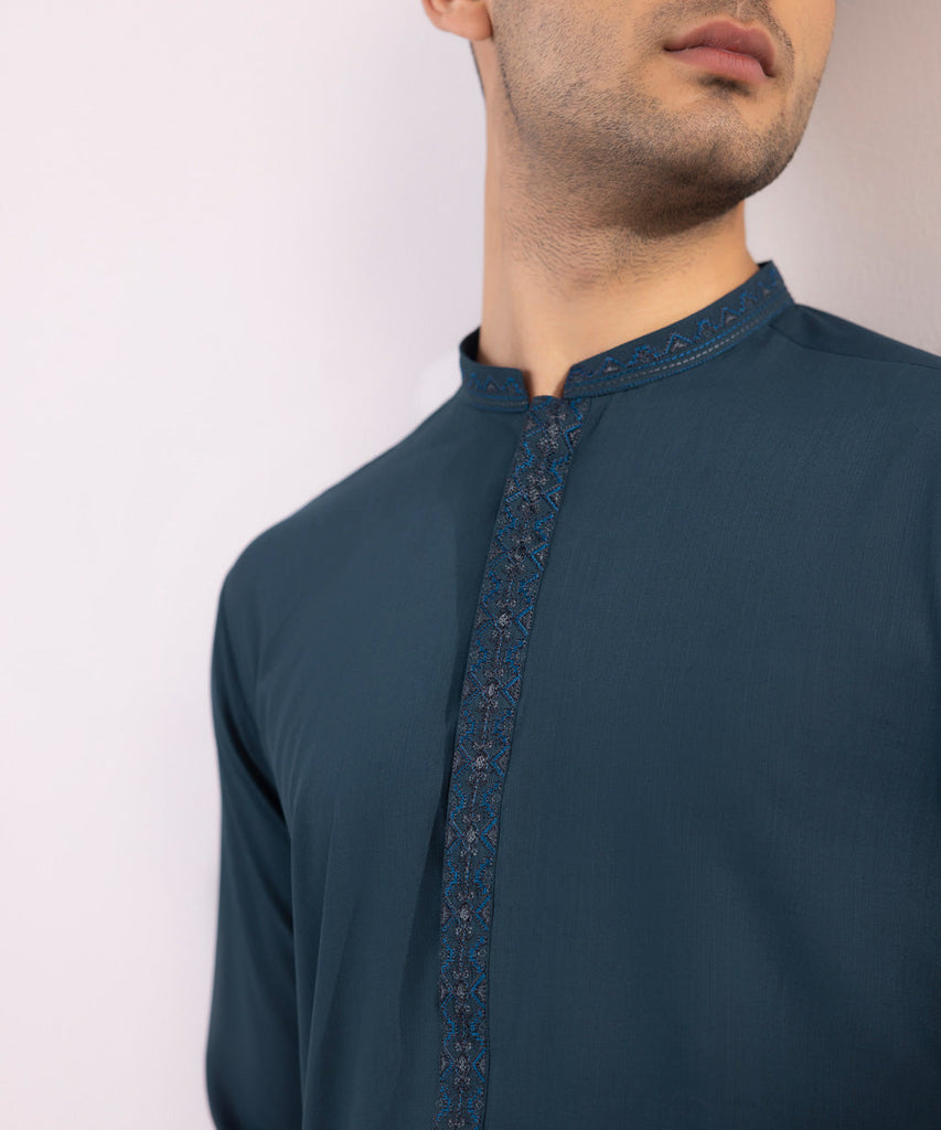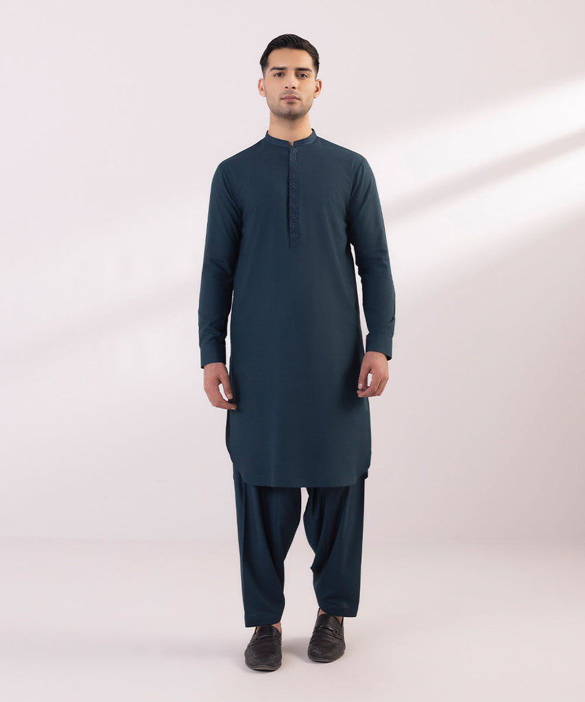 Create a traditional look this season in our blue embroidered wash & wear straight kurta paired with shalwar.