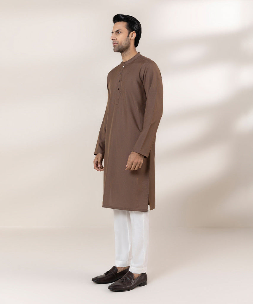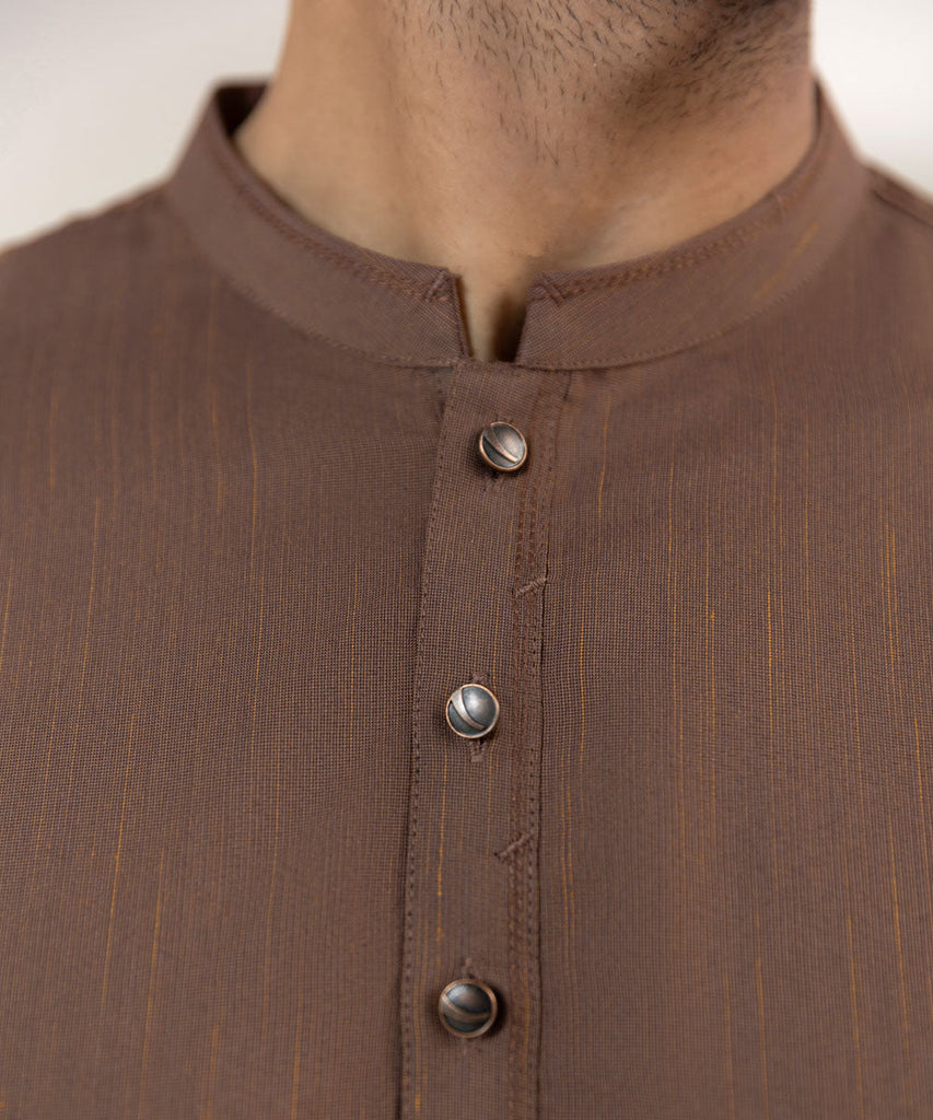 Make a dapper appearance in our rust brown kurta featuring thread detailing.