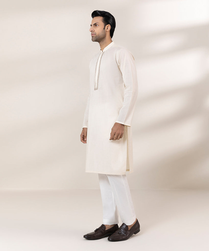 Refresh your wardrobe with our beige cotton slub kurta featuring embroidery on front panel.