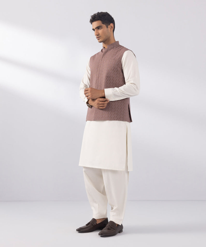 Make a dapper statement with our schiffli embroidered mauve waistcoat.
