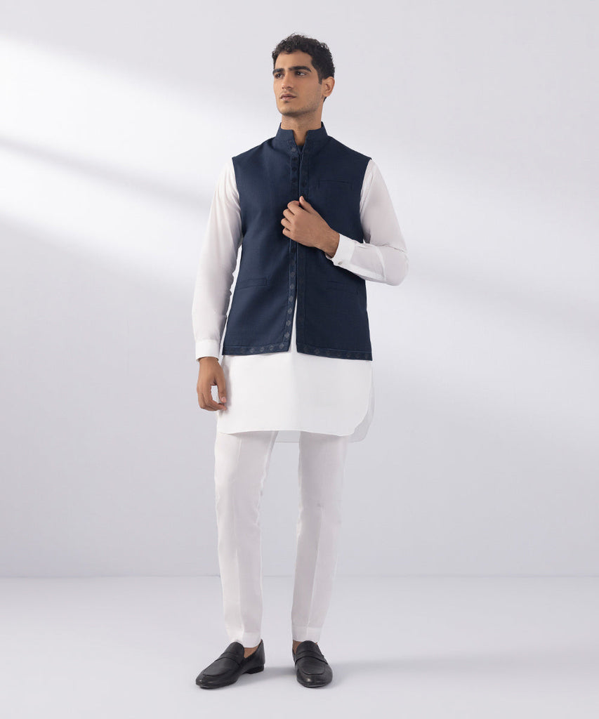 Make a dapper statement with our navy straight waistcoat featuring embroidery on the front and back.