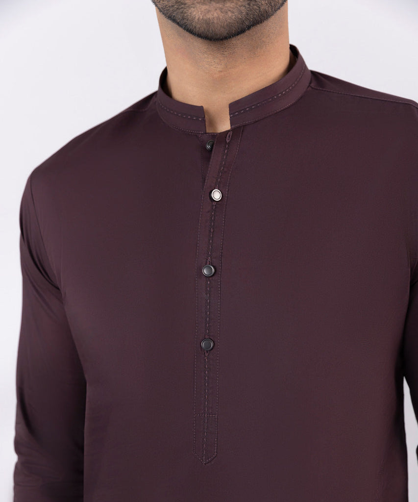Make a dapper statement in our lightweight, and breathable dark maroon two-piece suit. With the finest quality Egyptian cotton and premium ammonia finish, elevate your traditional look with unparalleled sophistication.