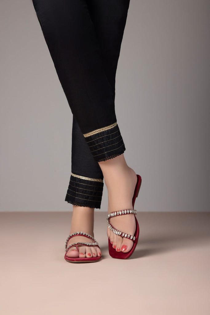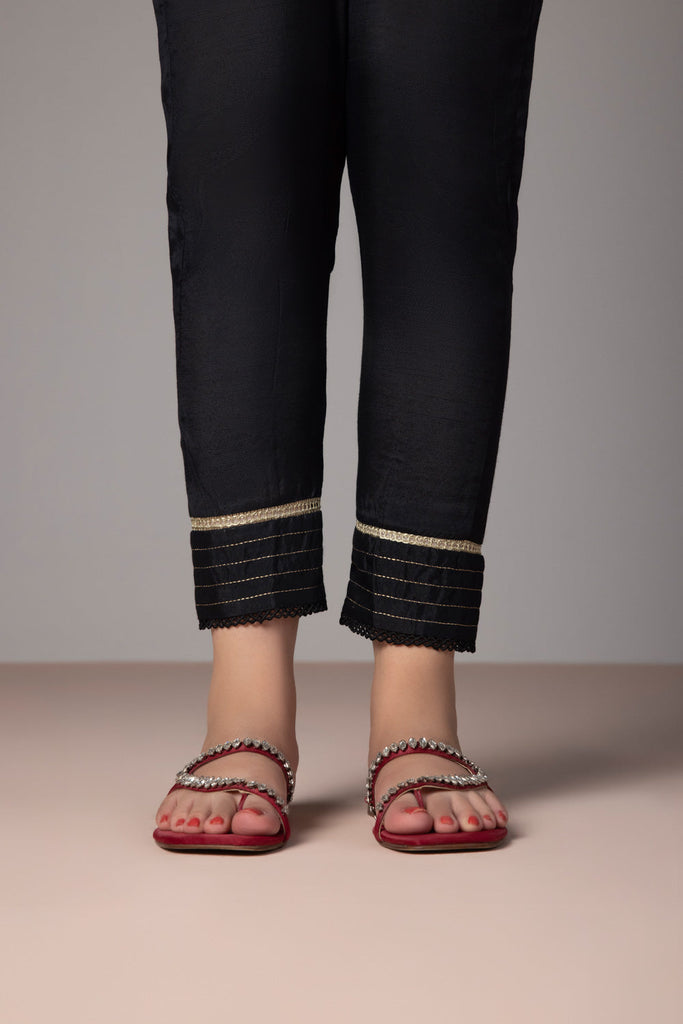 Elevate your outfit with this neatly stitched black hued cigrette pants in raw silk.