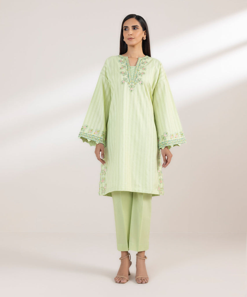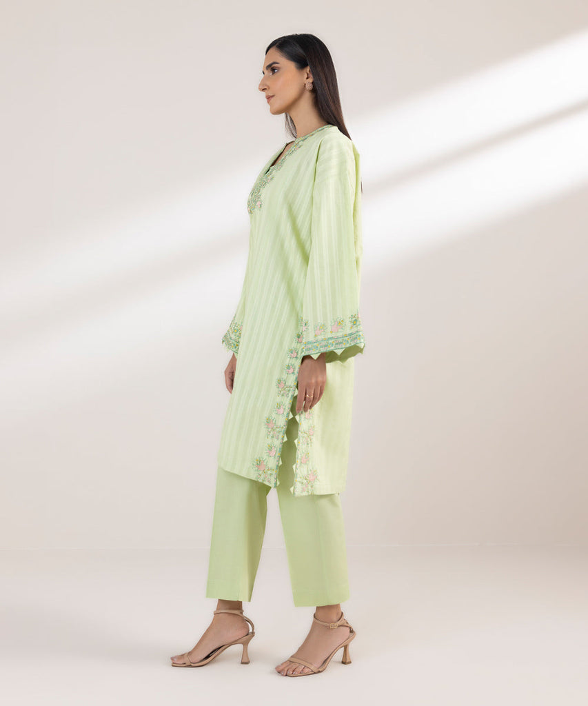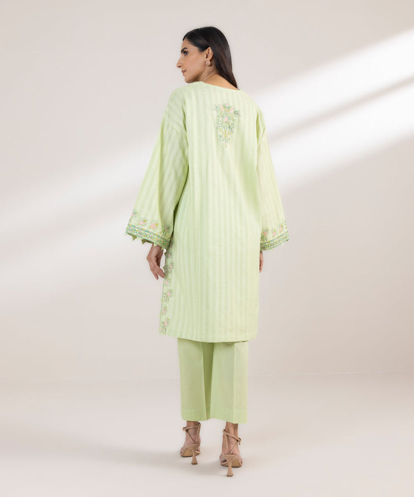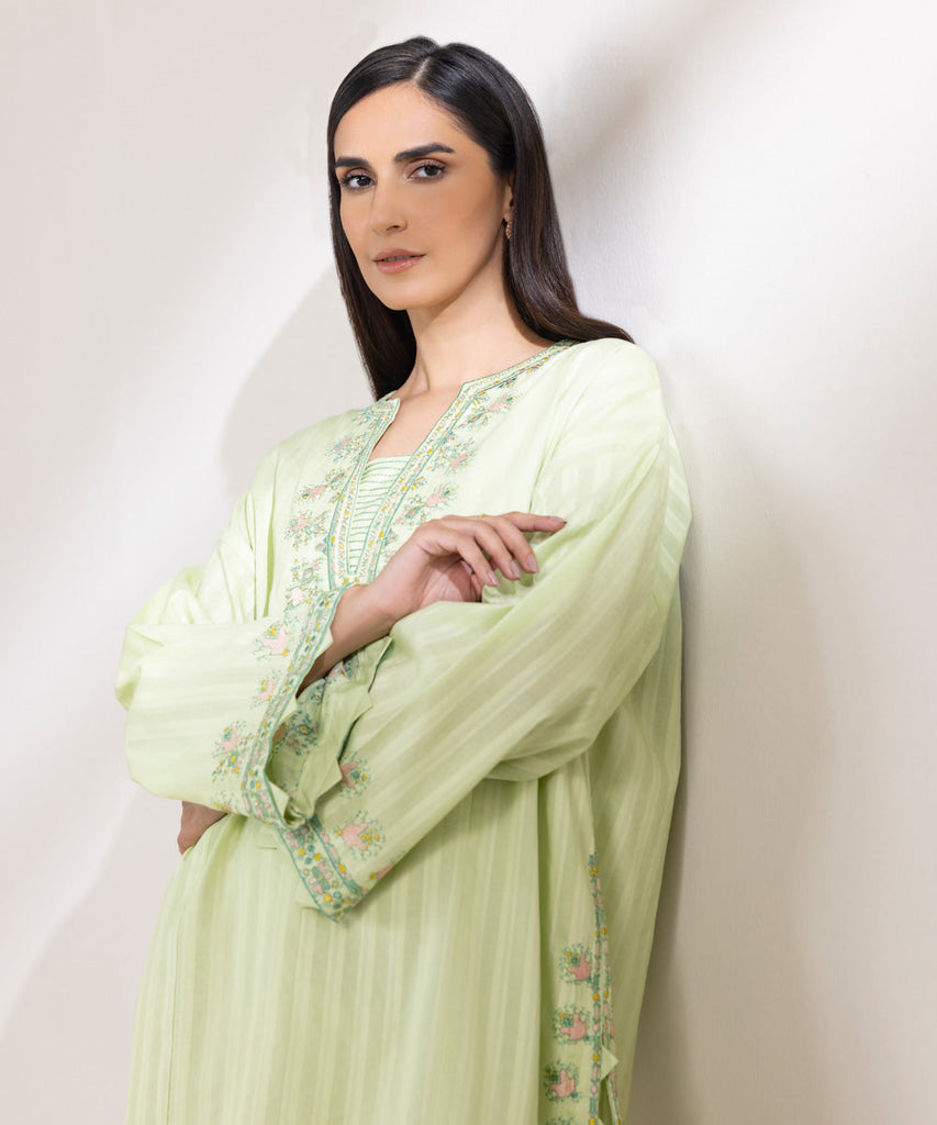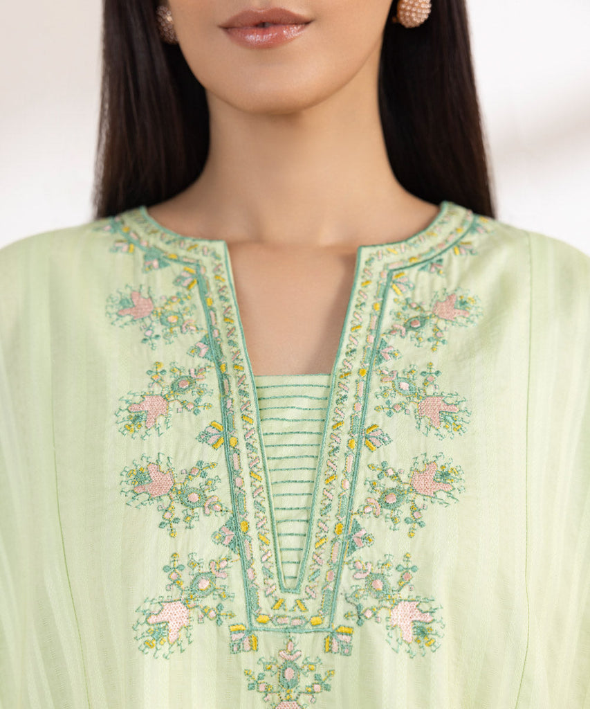 Boxy ShirtFor a chic festive look style our pistachio green, long boxy dobby shirt decorated with embroidery.