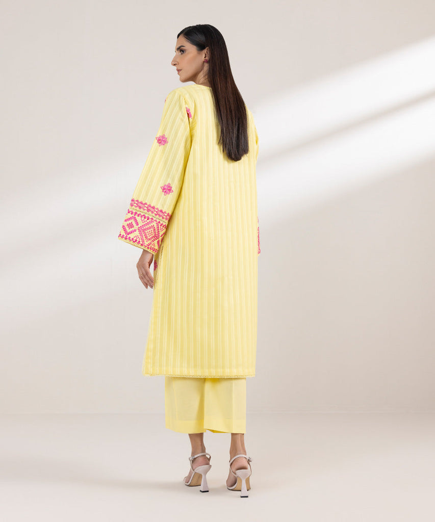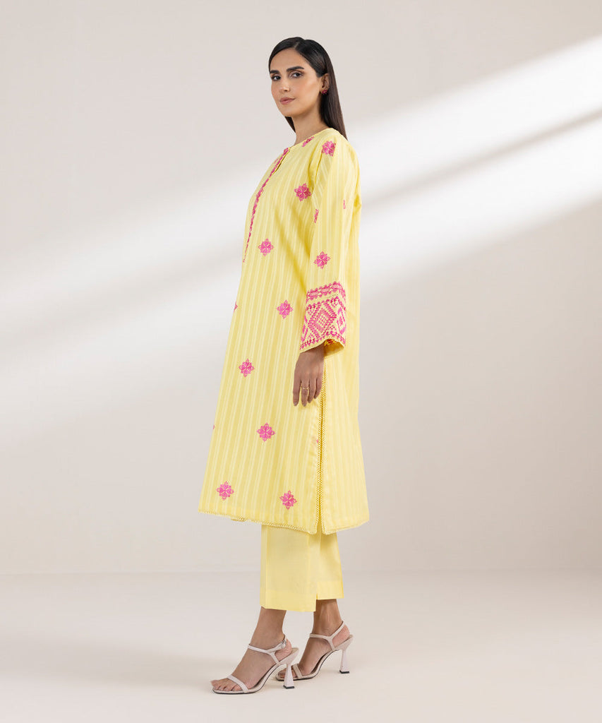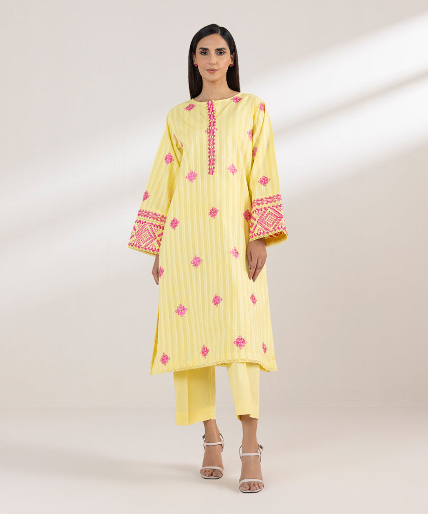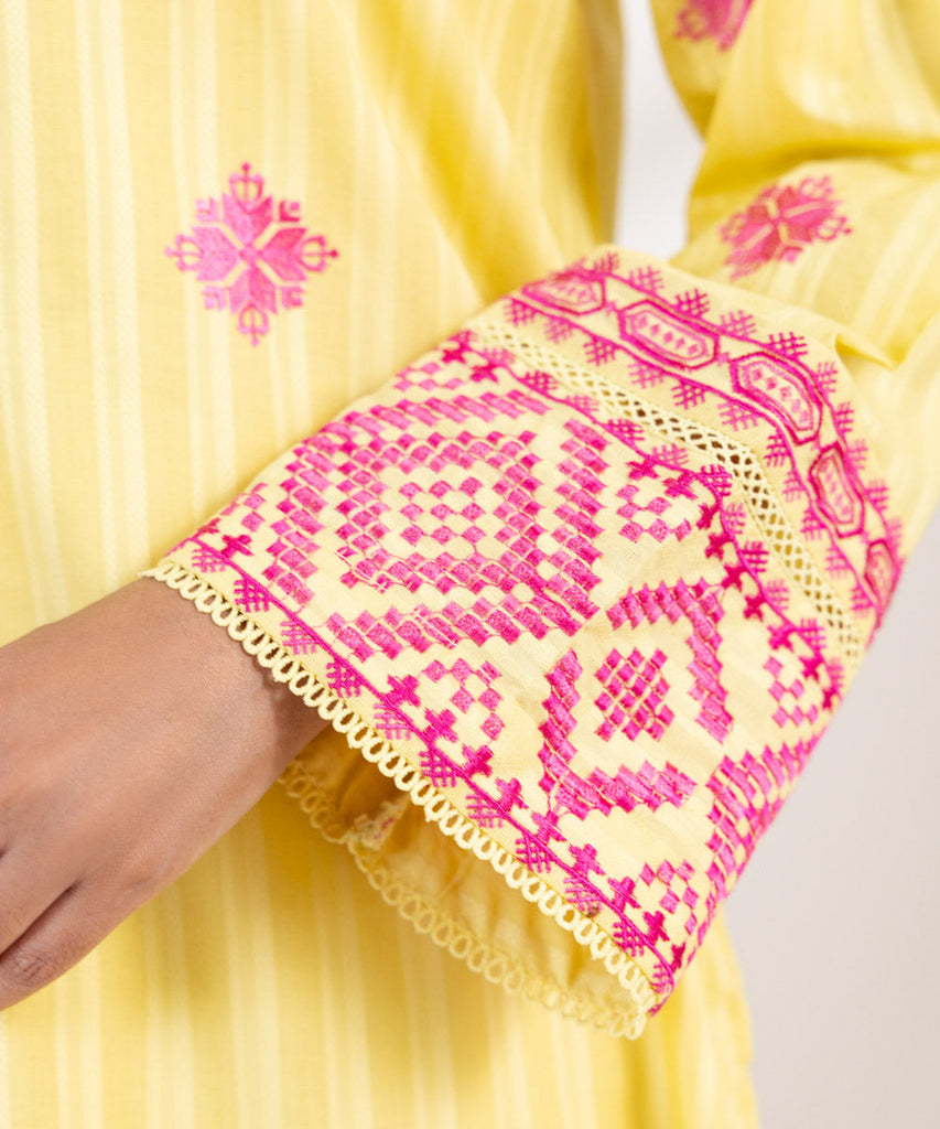 For a chic festive look style our bright yellow, long boxy dobby shirt decorated with embroidery.