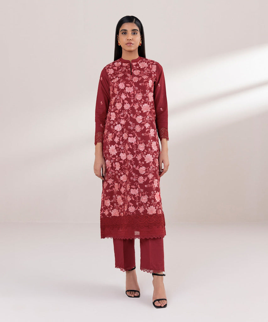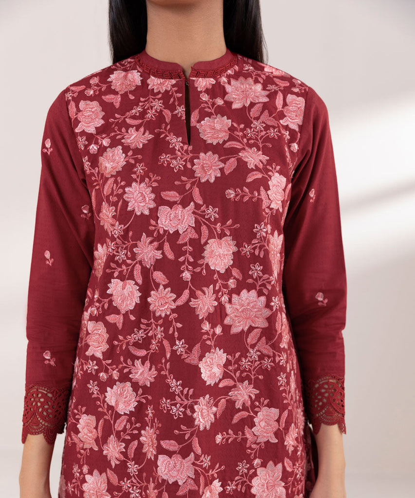 Straight KurtaElevate your festive style with our dobby deep red embroidered shirt featuring a band neckline with a s...