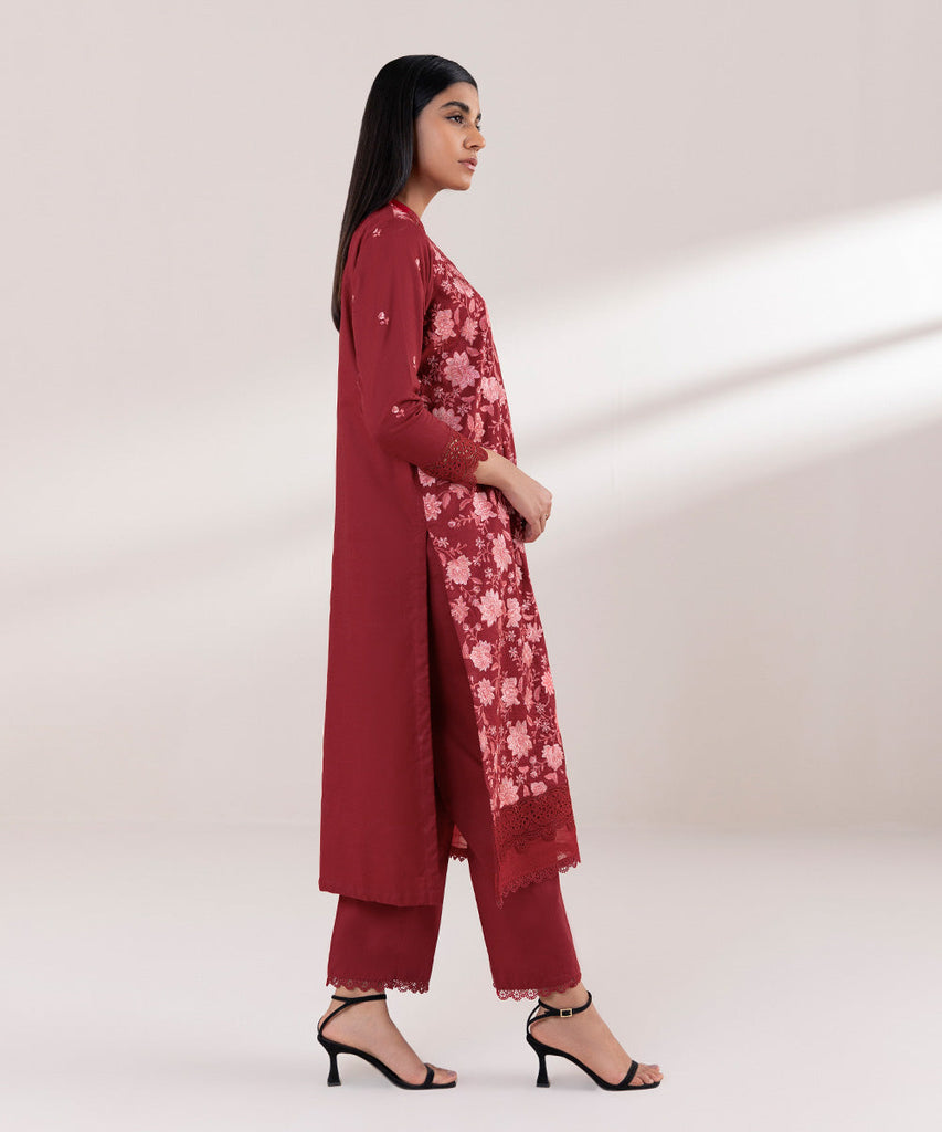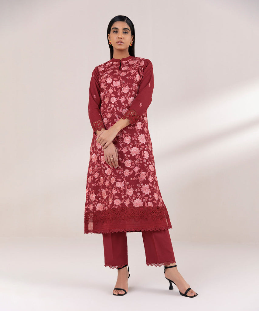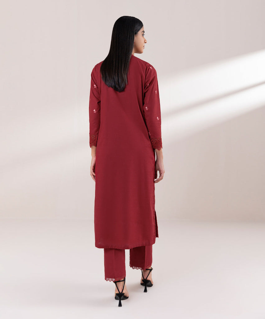 Elevate your festive style with our dobby deep red embroidered shirt featuring a band neckline with a slit.