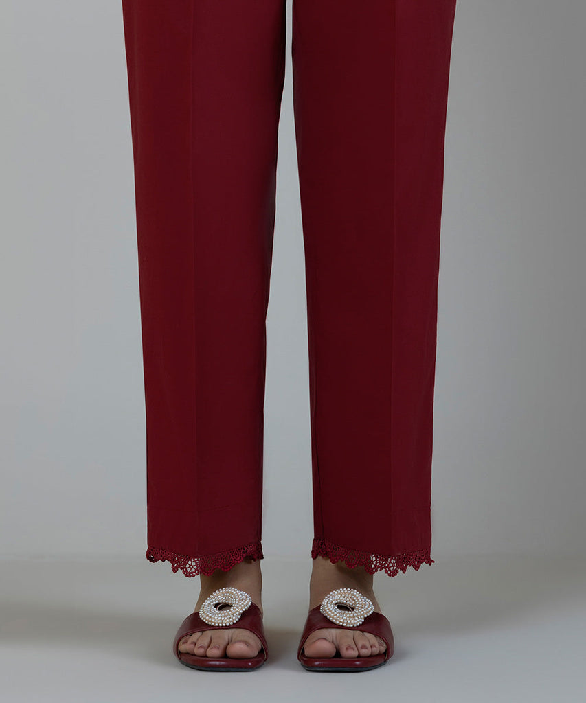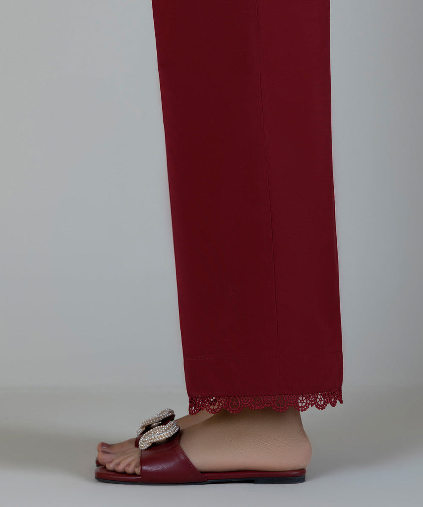 Complete your outfit with our dyed deep red straight pants with lace detailing.