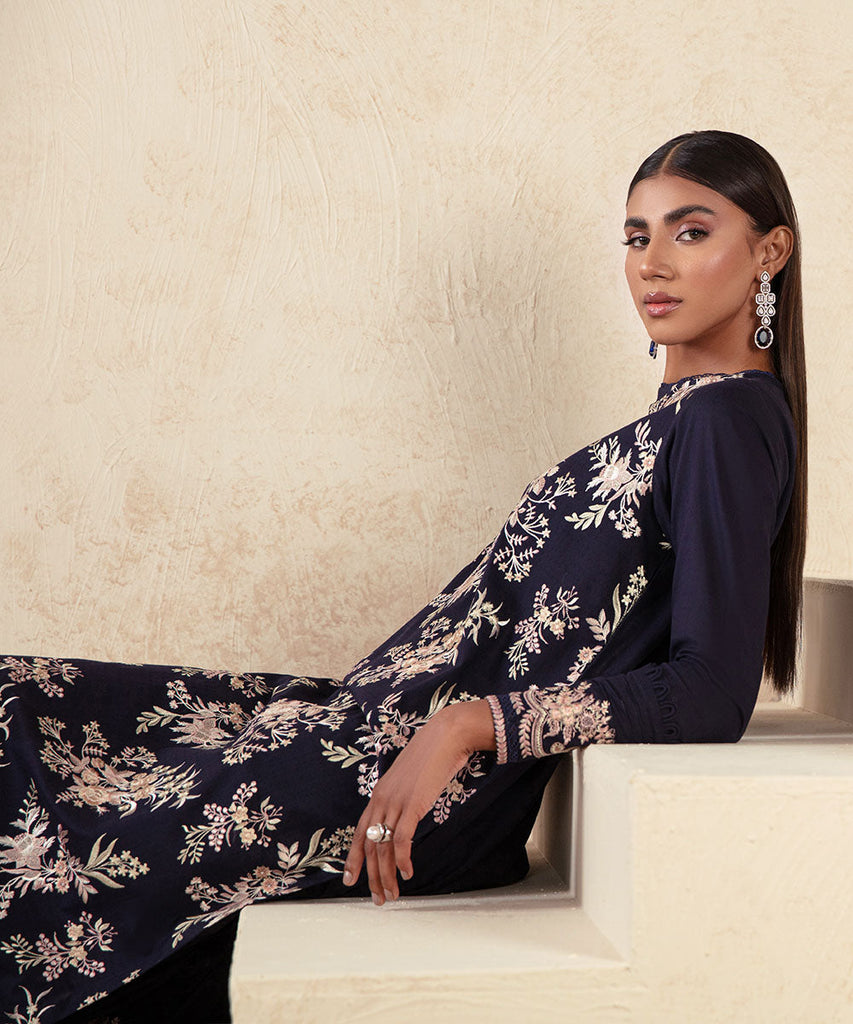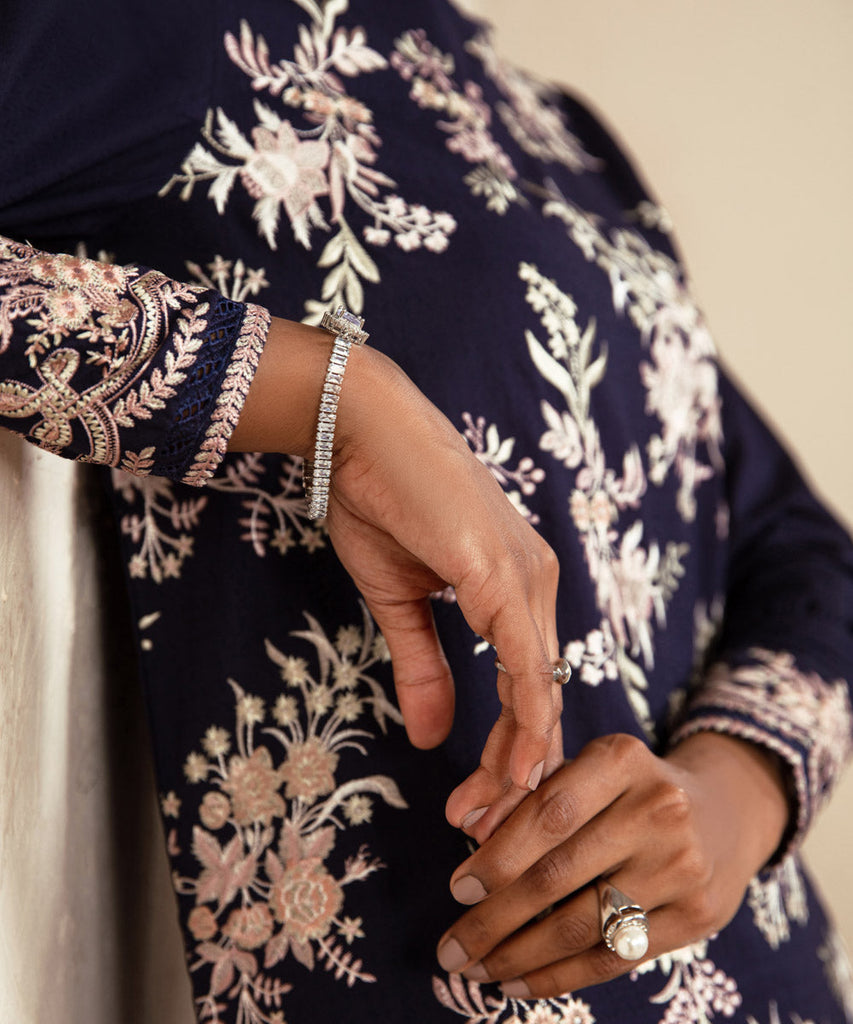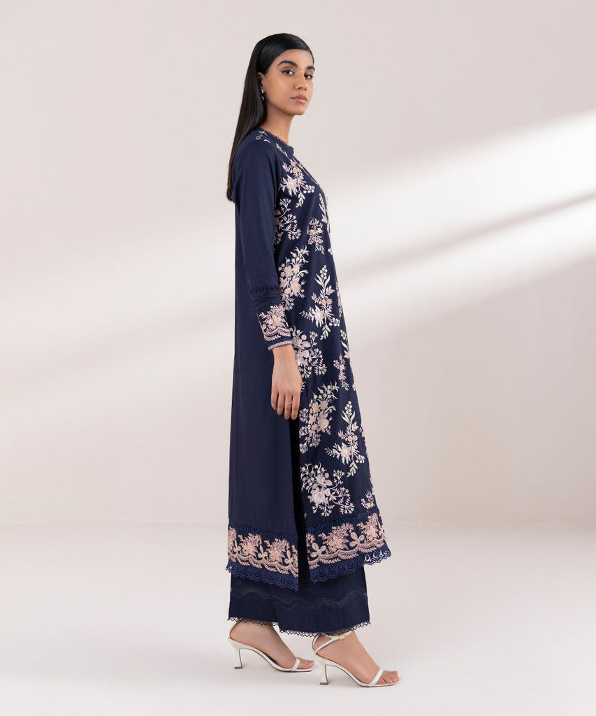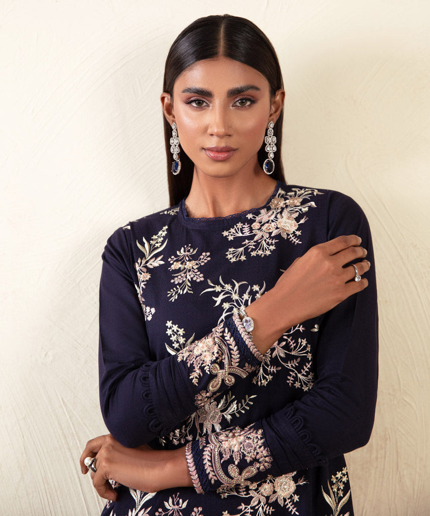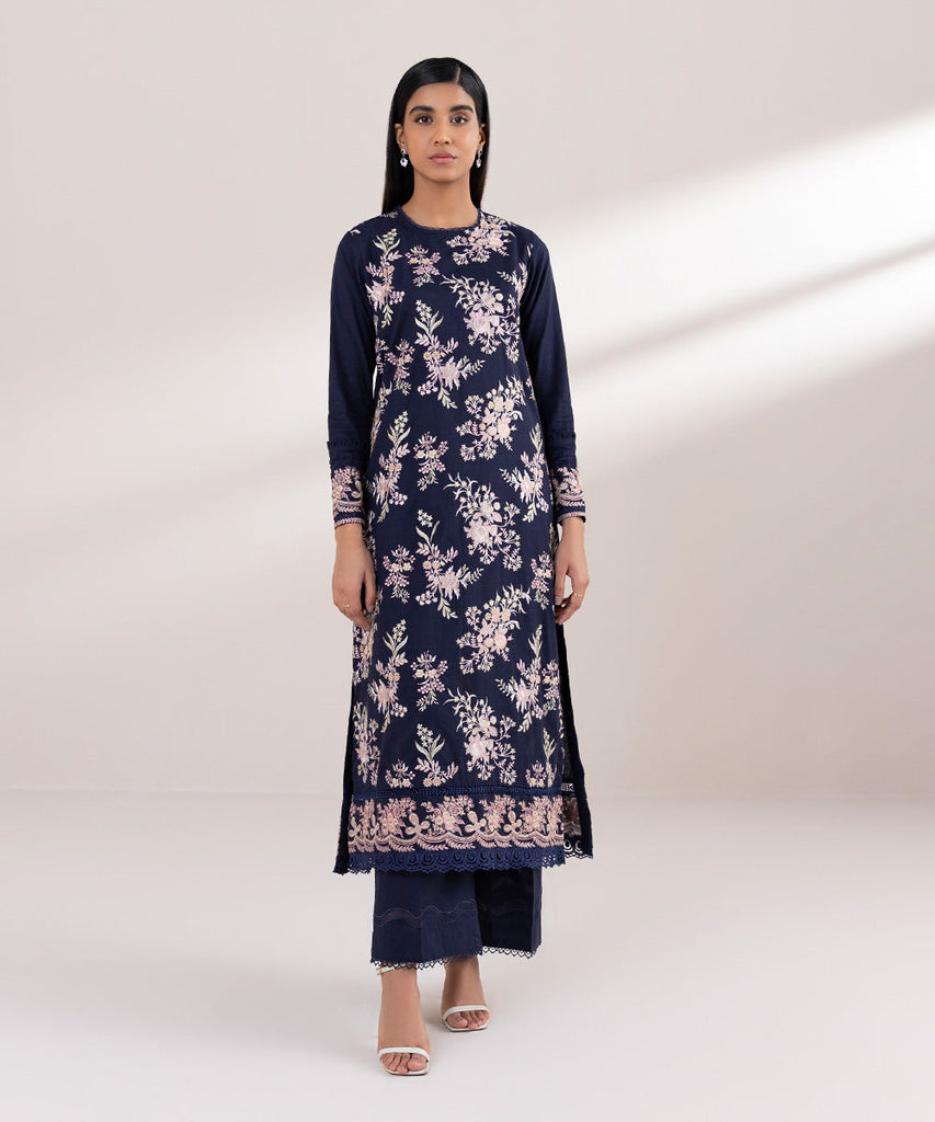 Adorn yourself in our dark blue A-line embroidered shirt featuring a round neckline.