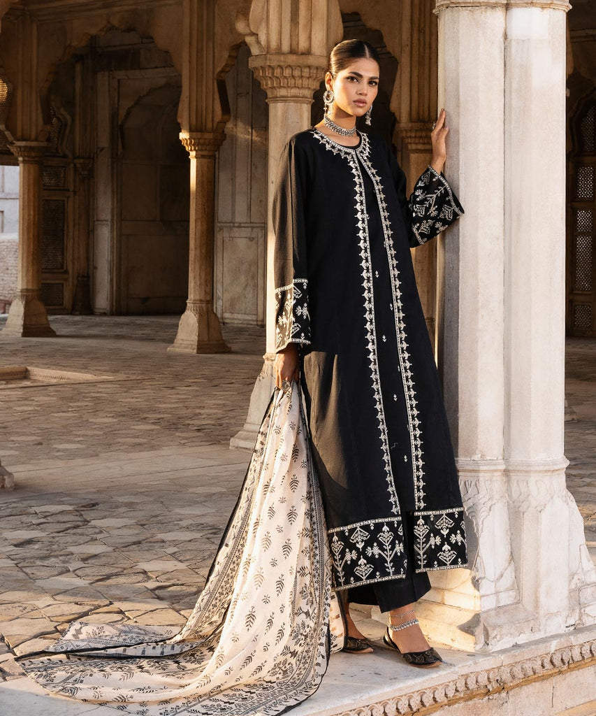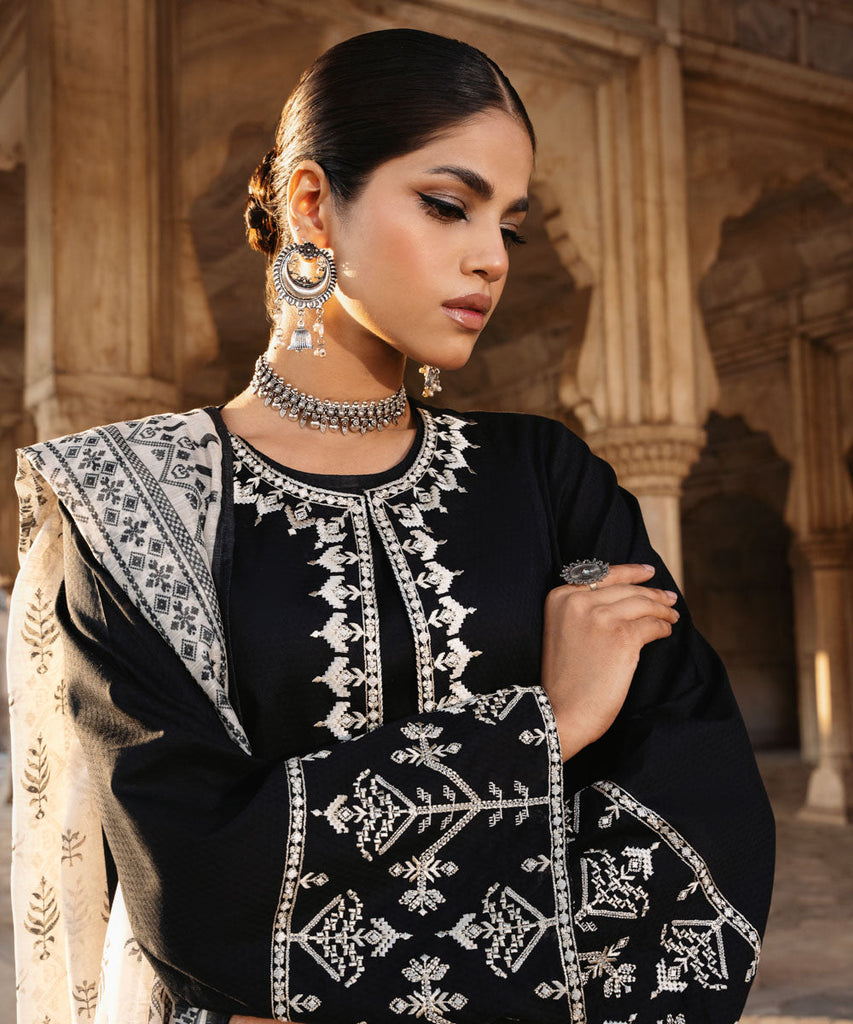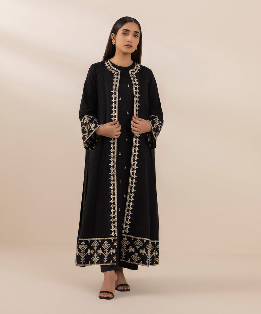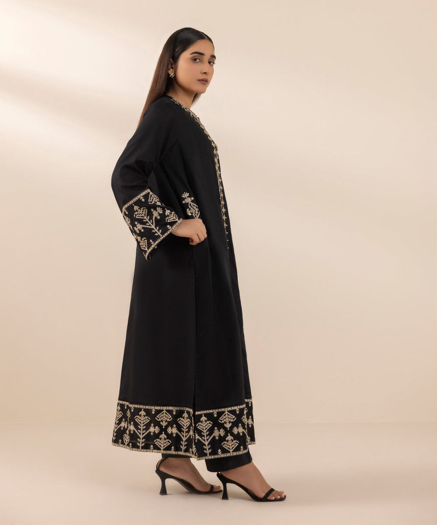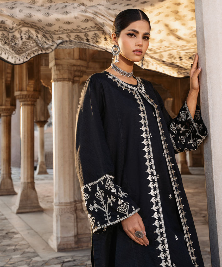 Straight Front Open KurtaElevate your style with our straight front open embroidered black shirt, featuring a crew ne...