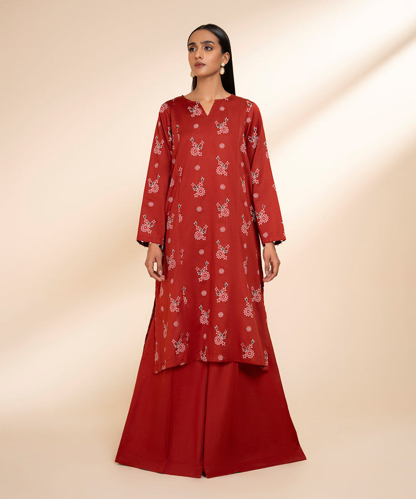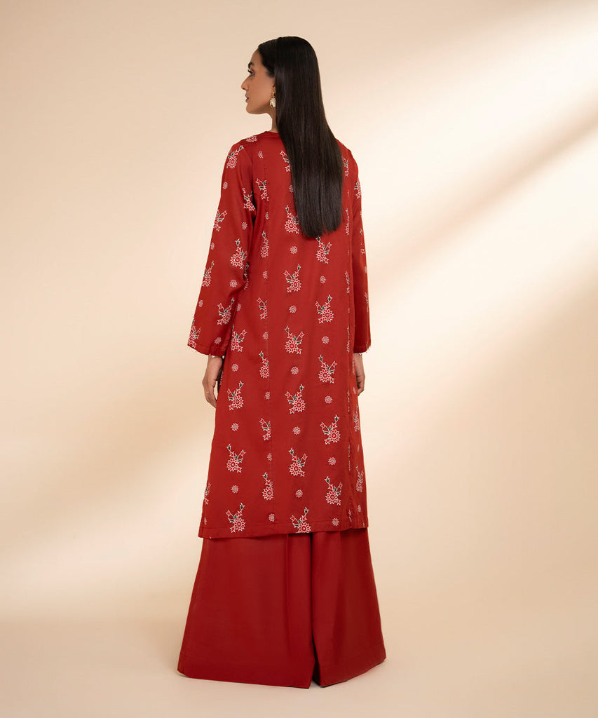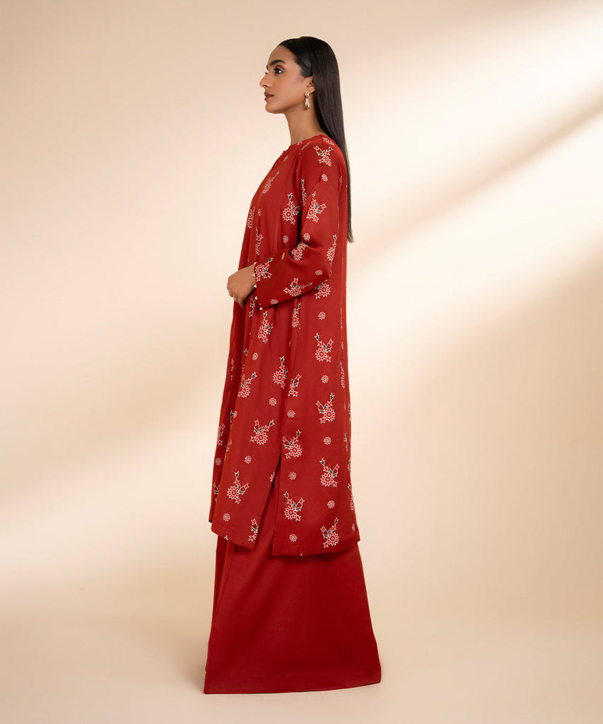 Elevate your festive look with our rust red A-line shirt featuring a round neckline with a slit.