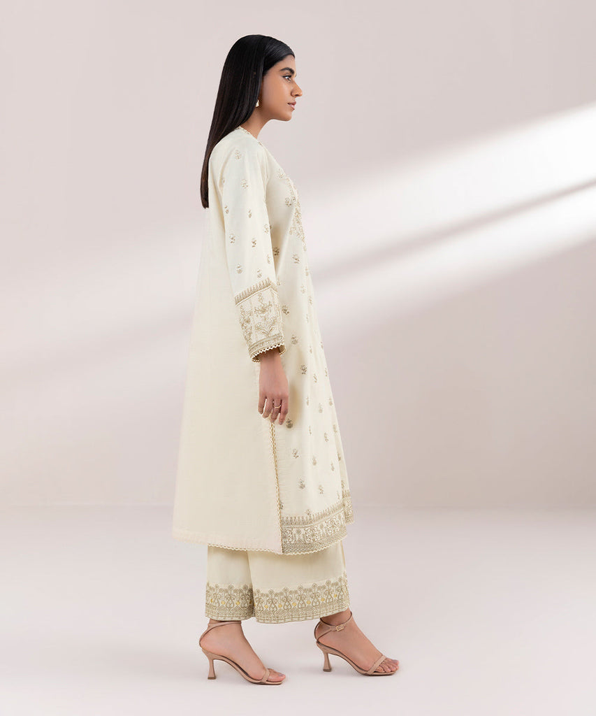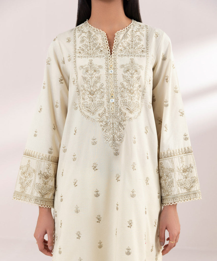 Turn heads this Eid with our light beige A-line shirt featuring a round neckline with slit.