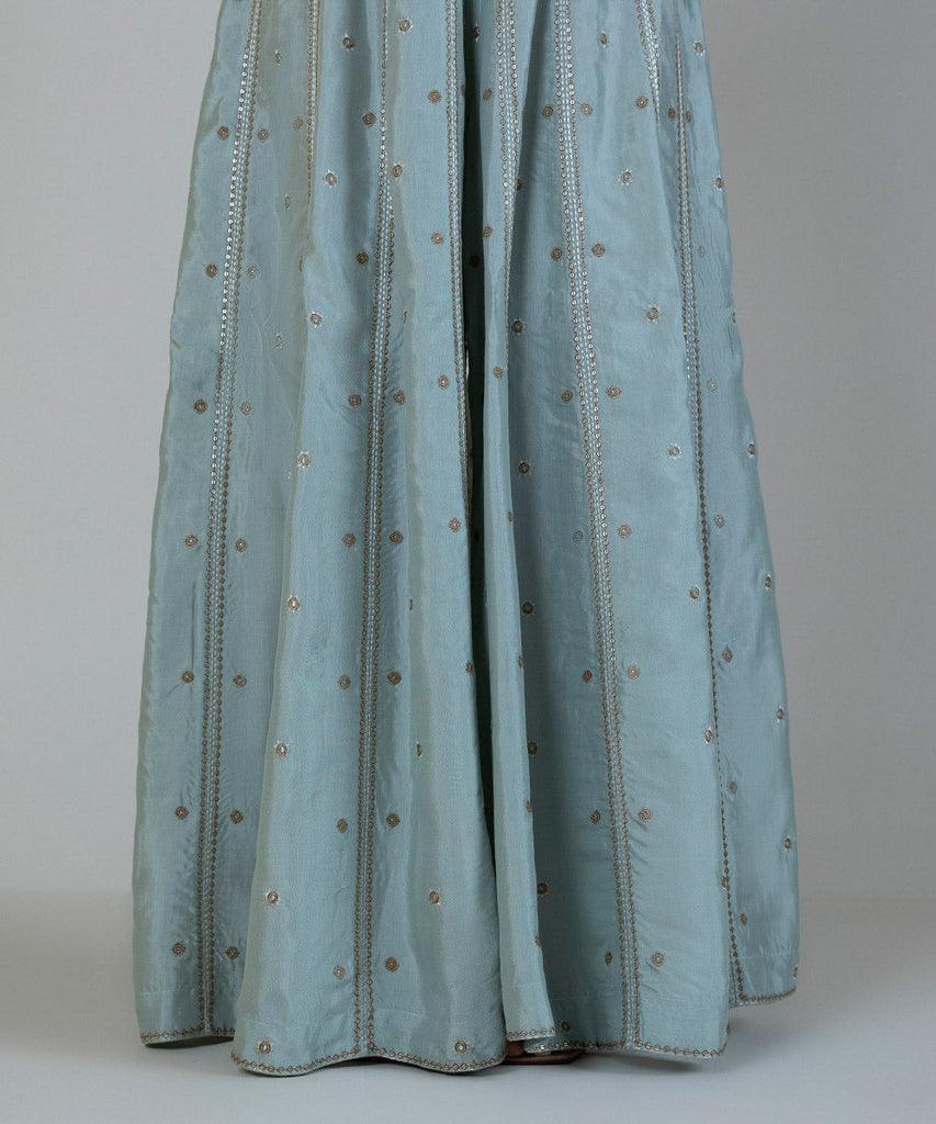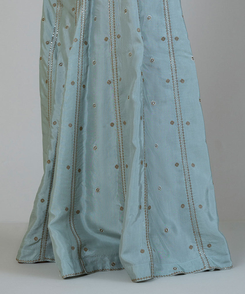 Complete your outfit with our powder grey blue viscose raw silk embroidered sharara.