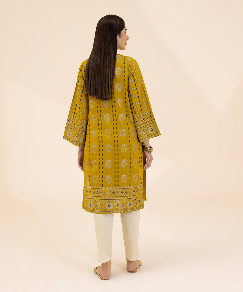 Straight Kurta Upgrade your wardrobe with yellow jacquard kurta featuring a round neckline.