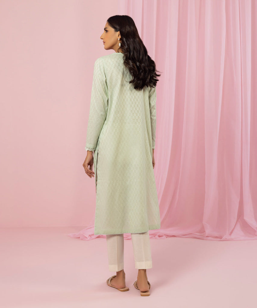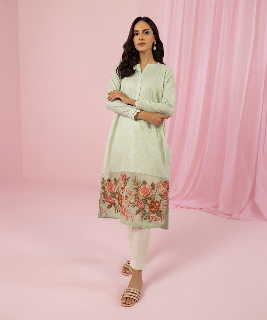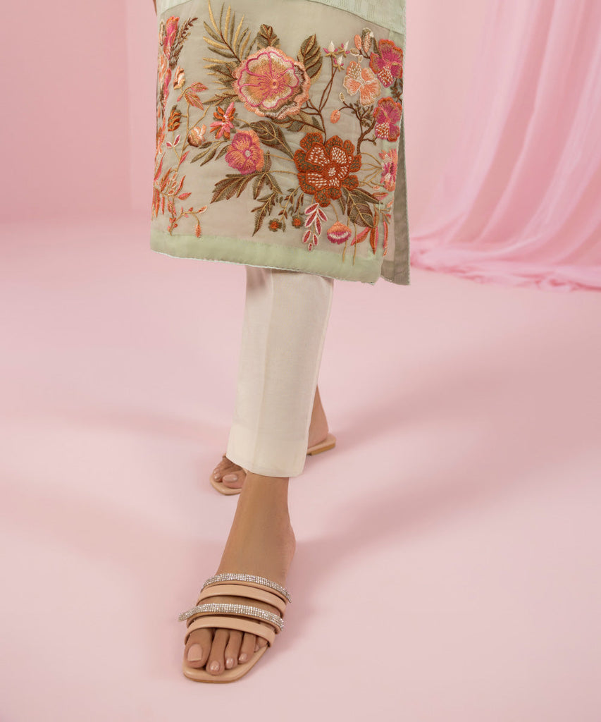Straight Kurta Stun in this pistachio green straight silhouette featuring floral front border.