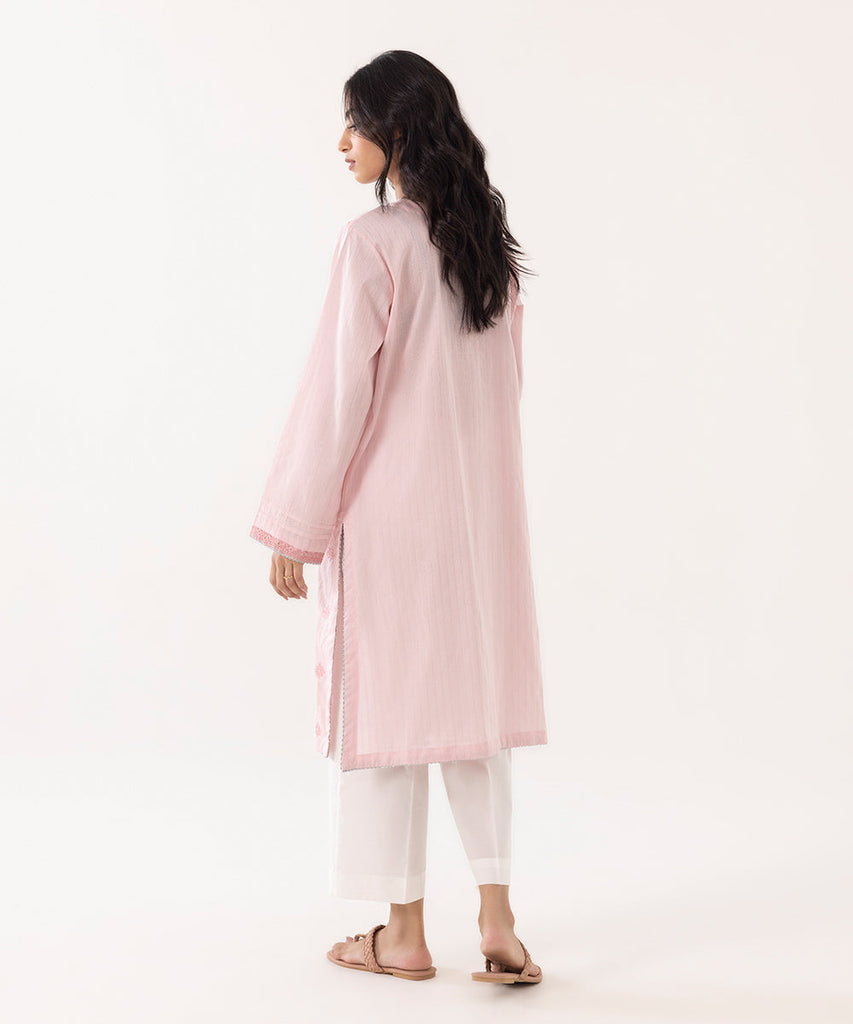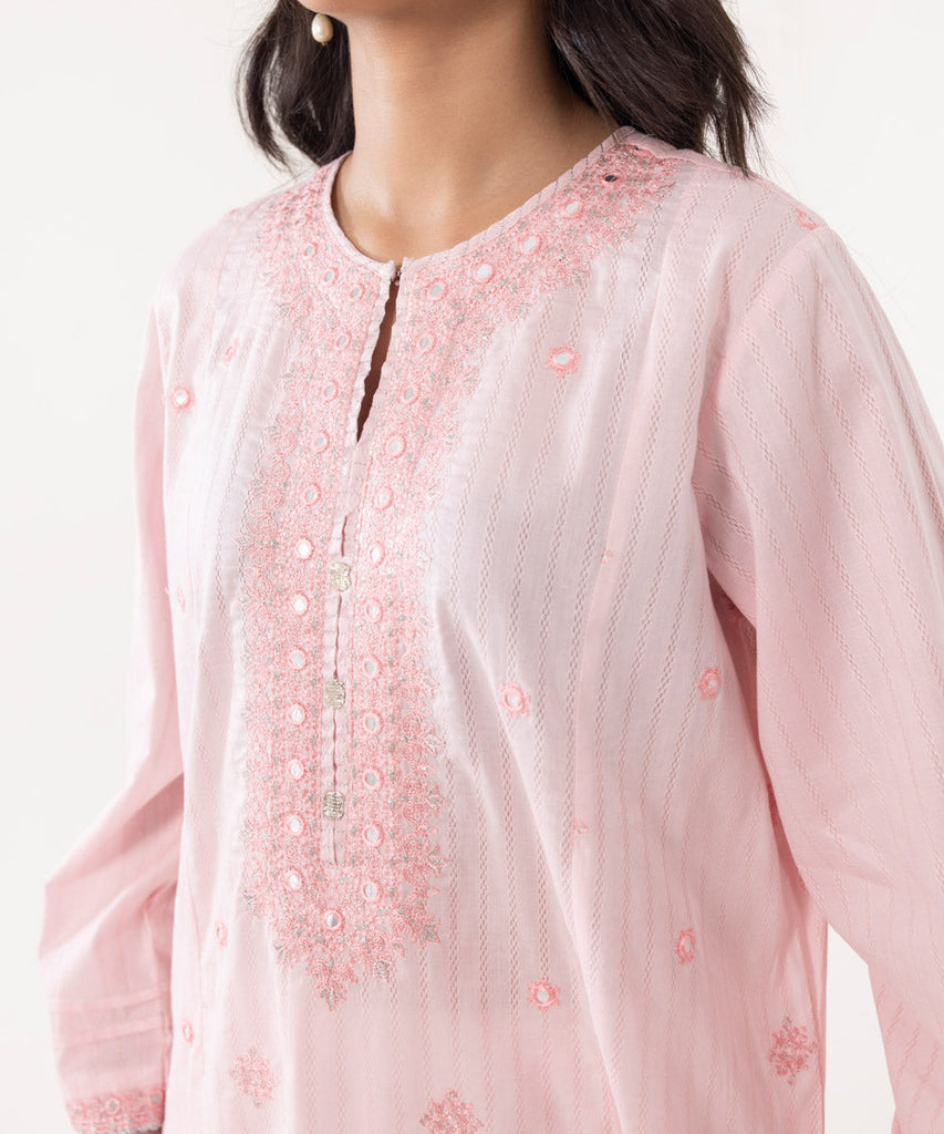Elevate your wardrobe with our leno kara straight shirt in pink featuring intricate embroidery.