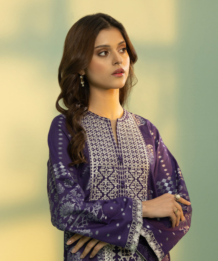 Plain Embroidered front, Plain back with Embroidered border, Round Neckline with slit, Full Sleeves with Embroidered border.