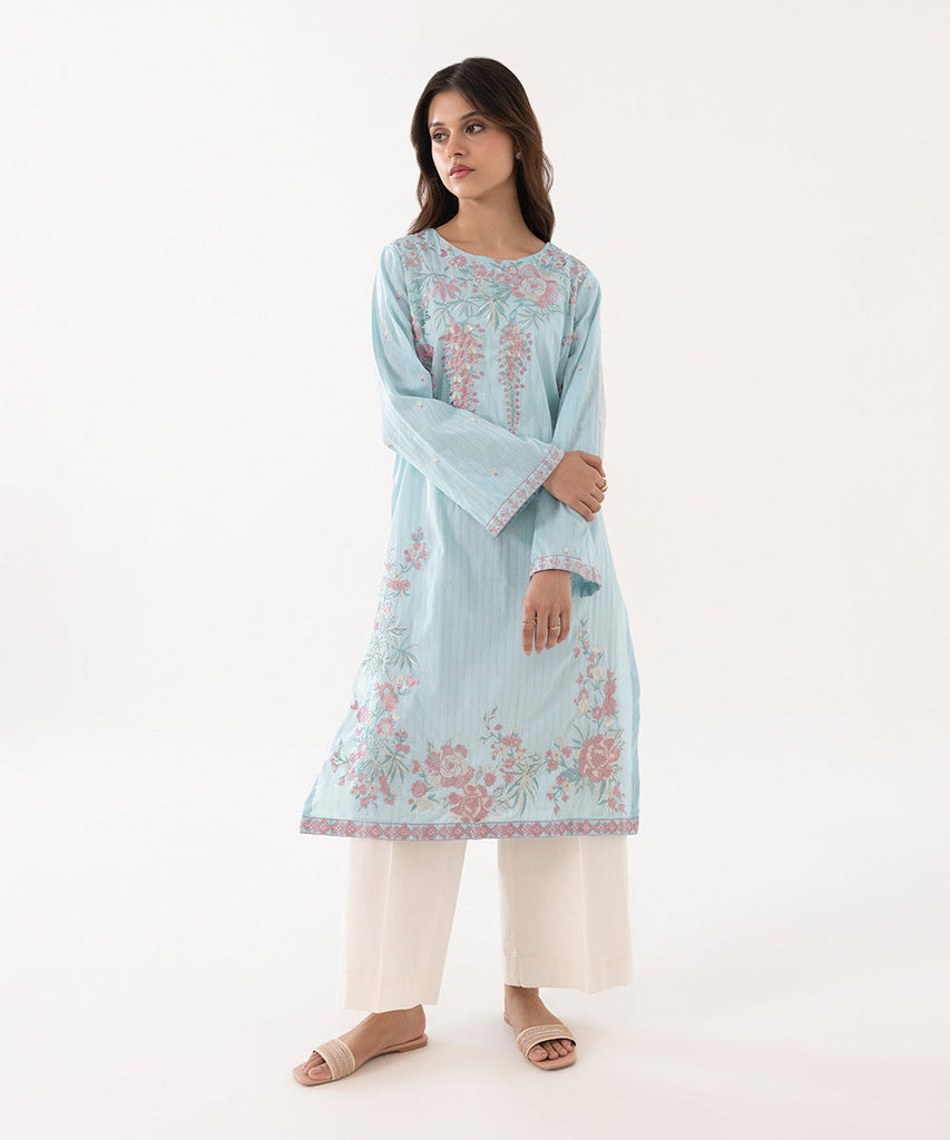 Dyed Embroidered Front, Dyed Plain Back, Full Sleeves With Embroidery, Round Neckline
