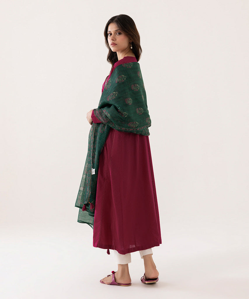 Our red flared A-line leno kara ensemble is designed with meticulous attention to detail, exuding an aura of elegance and timeless charm accented with buttons and paired with a green printed manar dupatta with tassels.