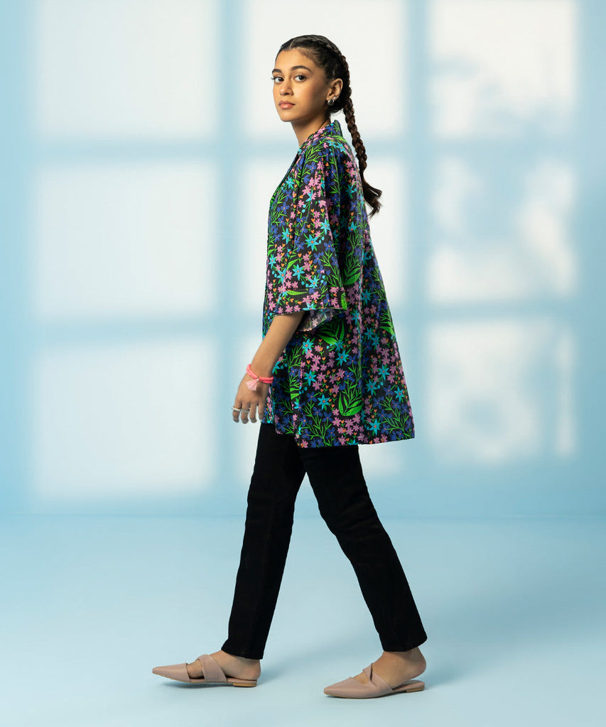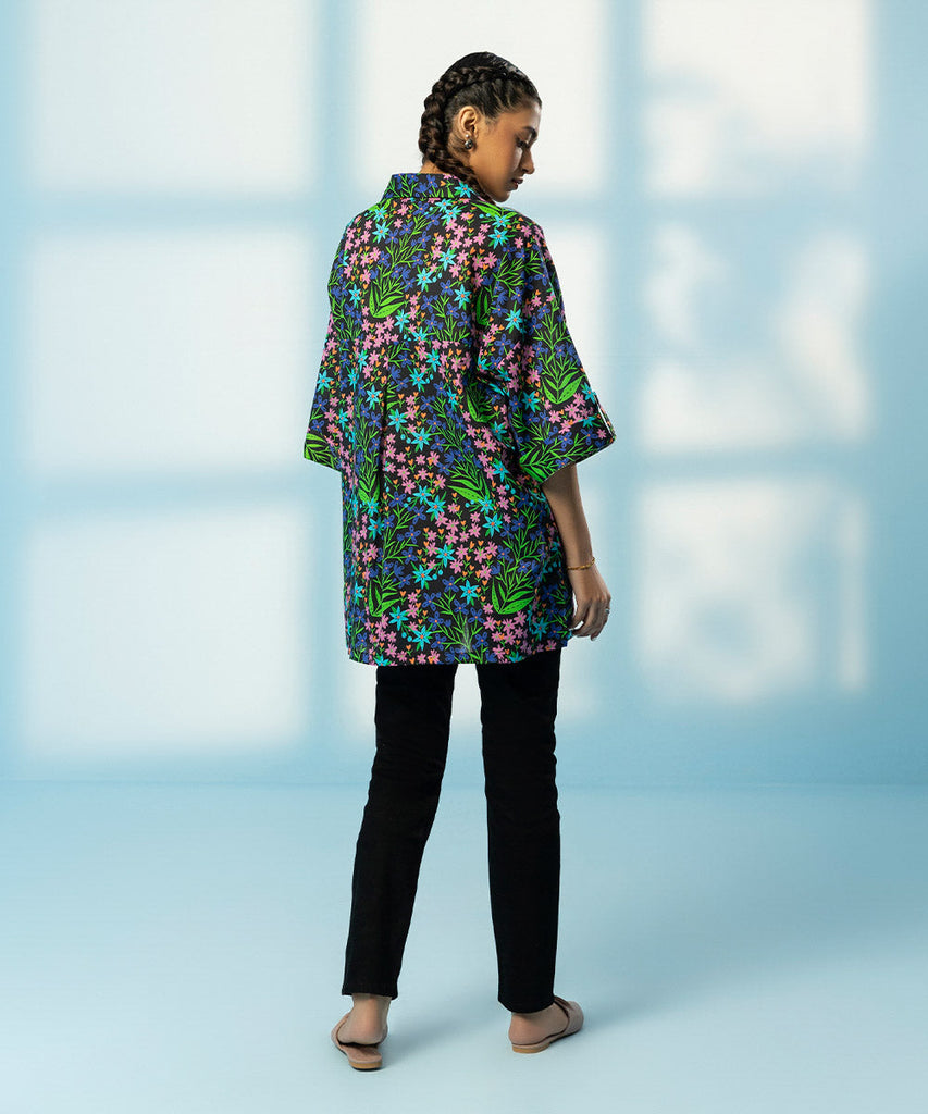Printed front, Printed back, Collared Neck with slit, Medium Sleeves.