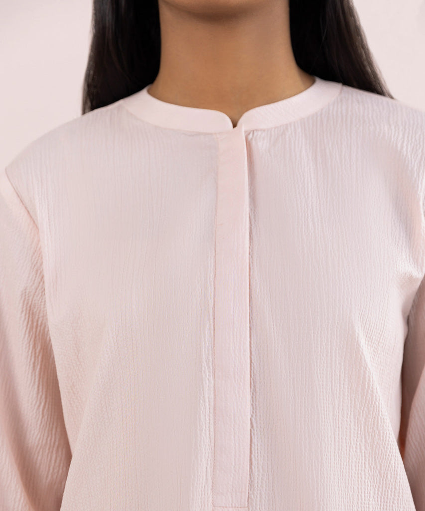 Standout with your summer style in our soft pink straight shirt featuring a band neckline with placket.