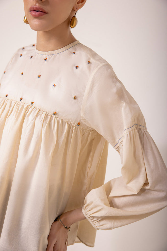 Turn heads in this impeccable and minimalistic off-white textured lawn fusion top, with a round neckline and short hem.