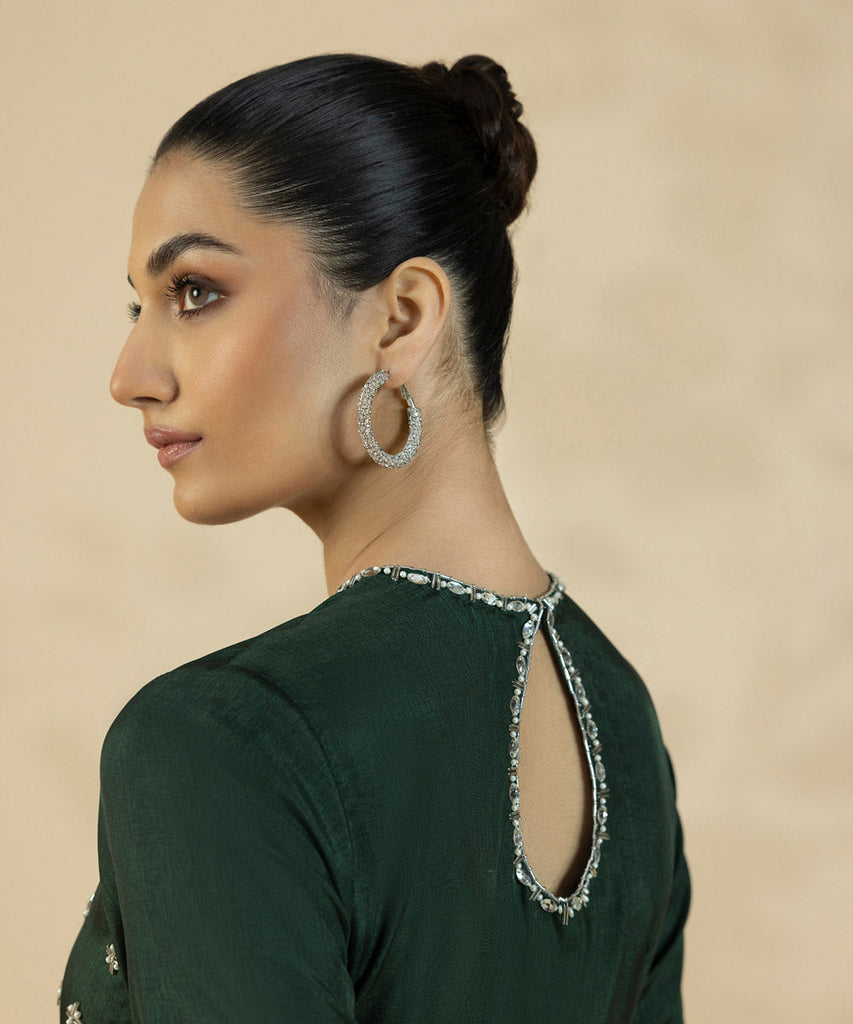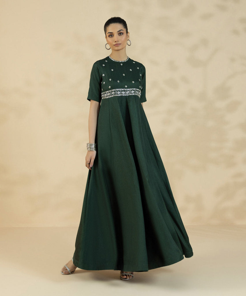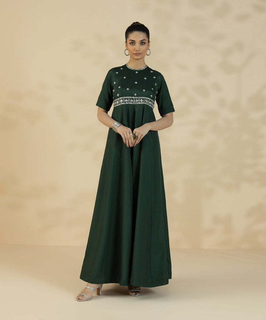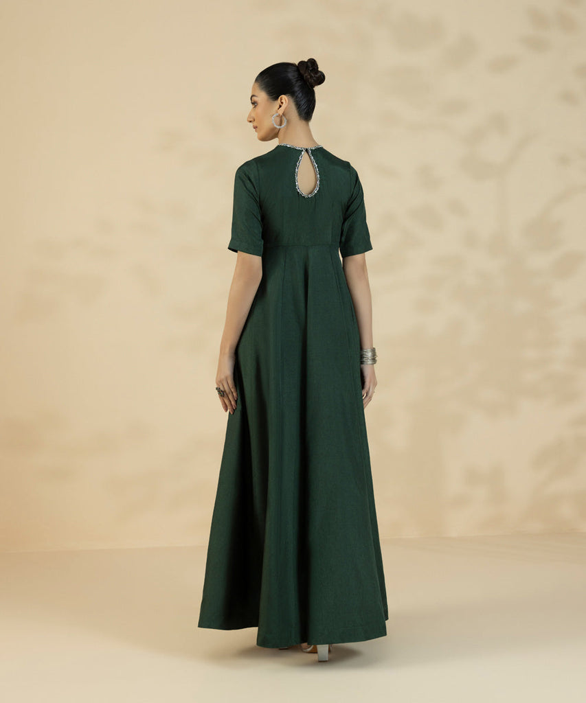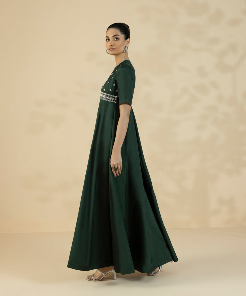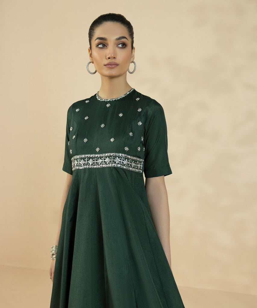 Twirl away this season in this green silk pishwas featuring hand embellished body paired with straight pants.