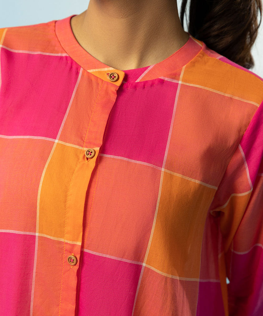 For a funky look, wear this colourful yarn dyed fusion shirt with a round neckline.