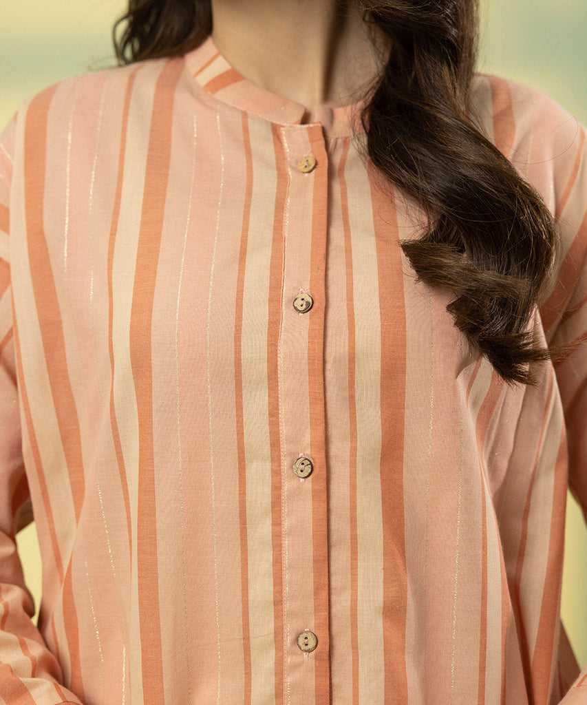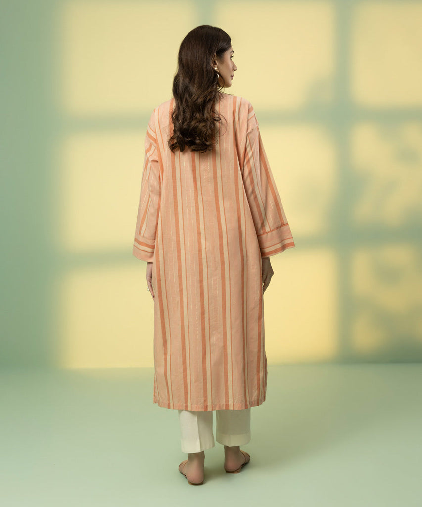 Create an effortless look in this straight yard dyed peach kurta. Details: Plain front, Plain Back, Band Neckline wit...