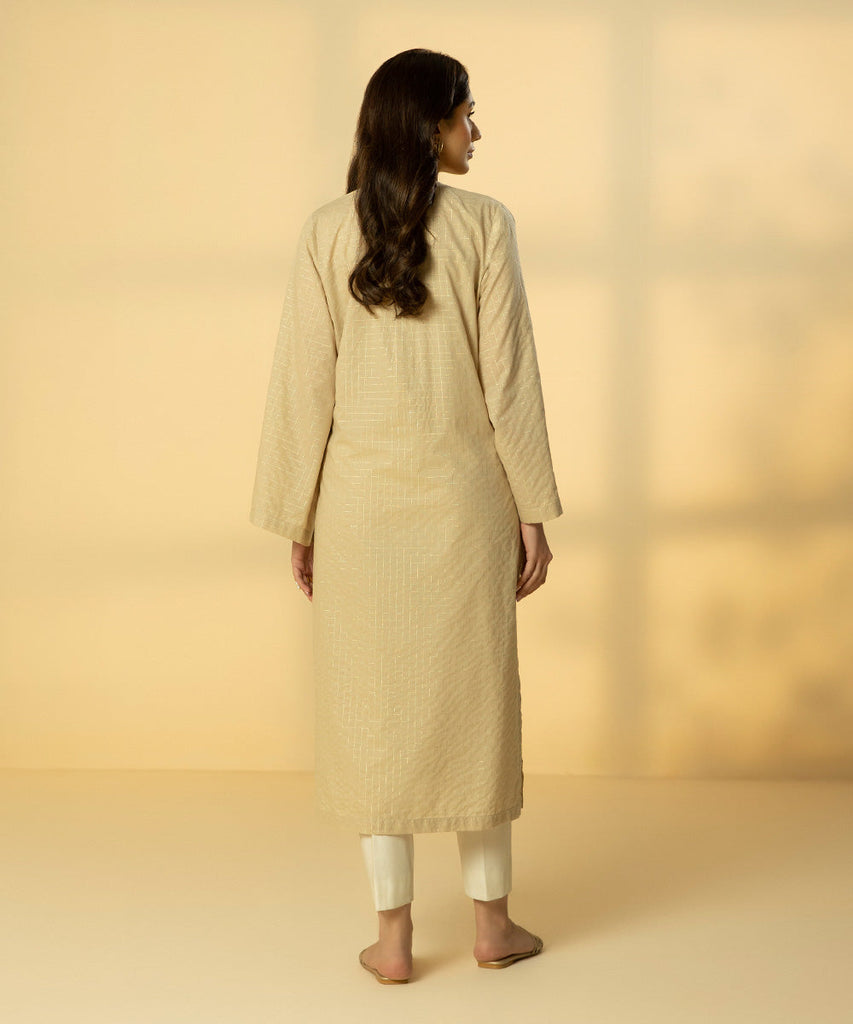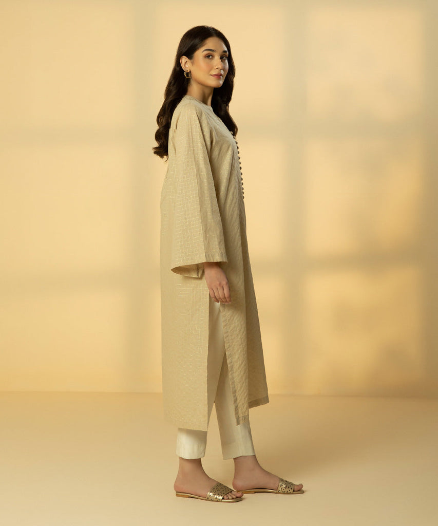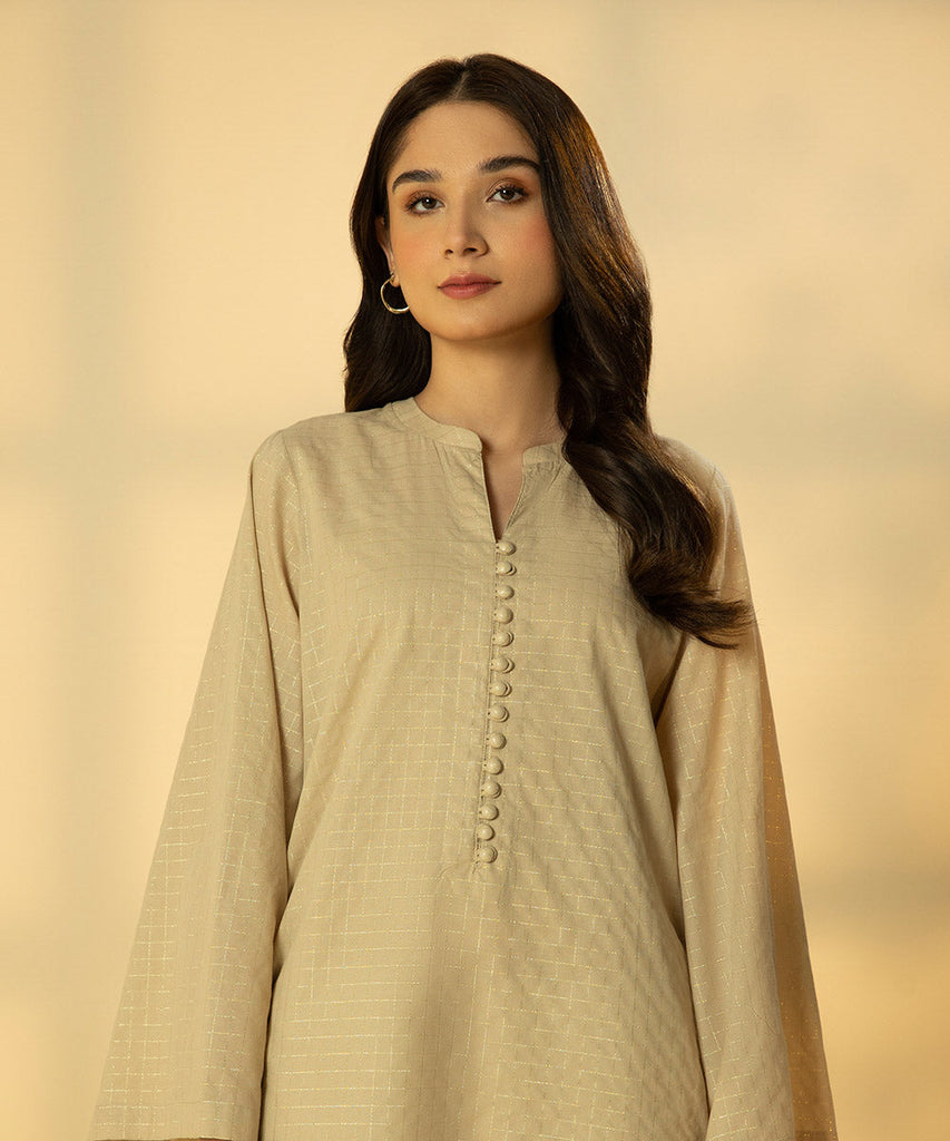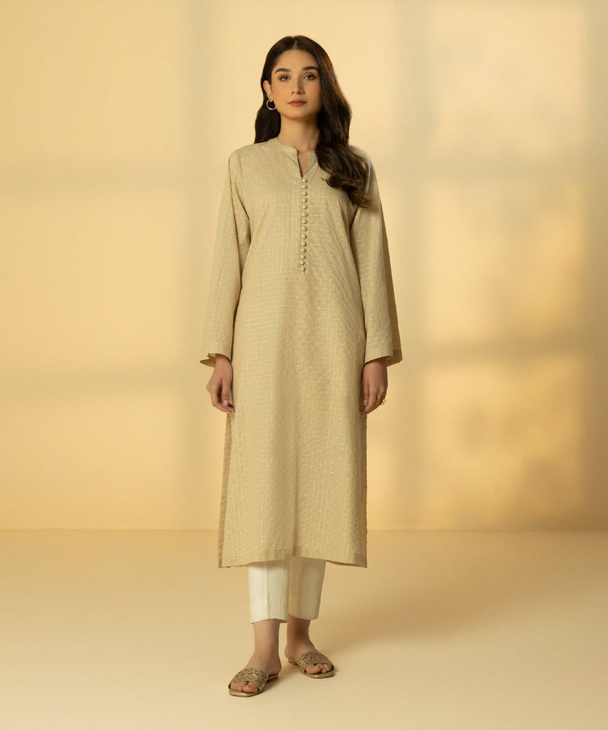 Create an effortless look in this plain straight yard dyed beige kurta with a ban neckline with a slit.