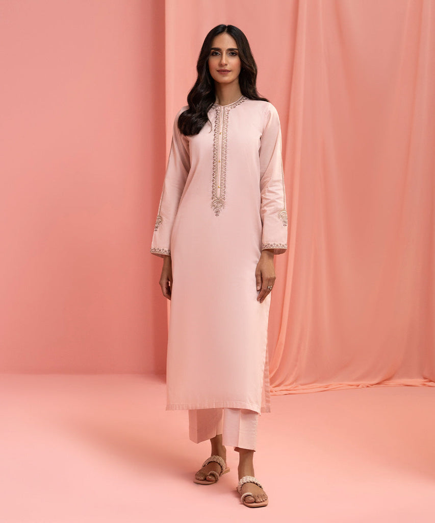 Plain Front with Embroidered Neckline, Plain Back, Full Sleeves with Embroidered Border, Round Neckline with slit