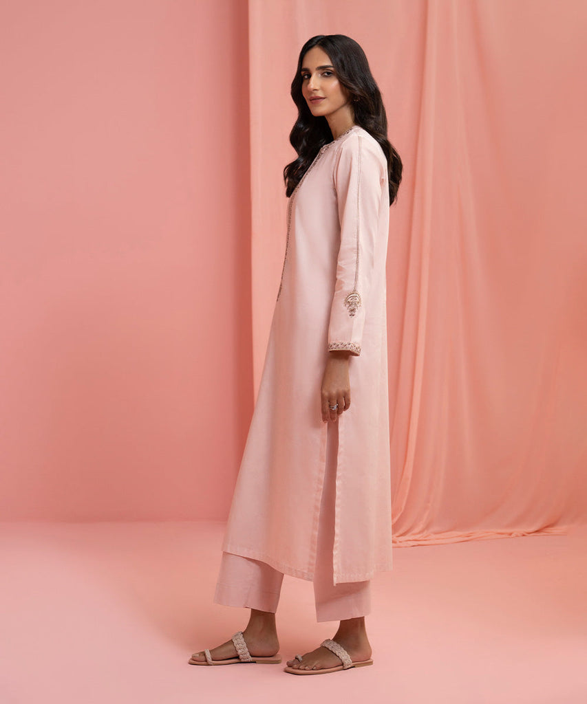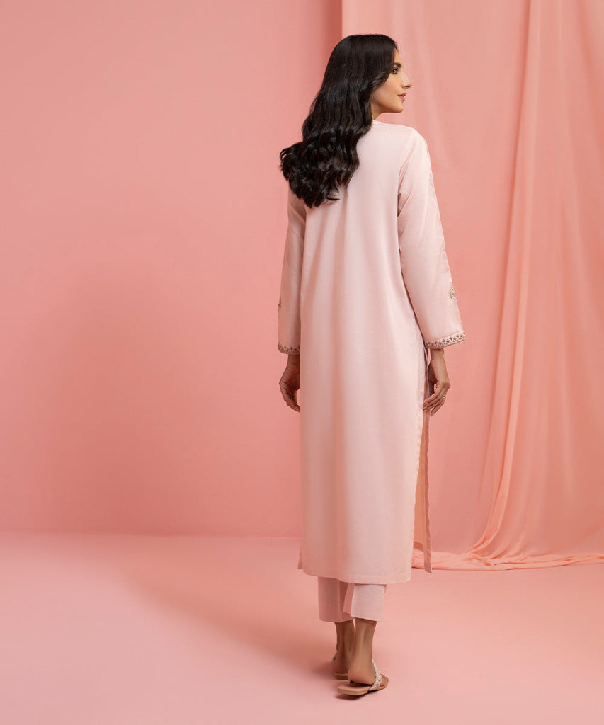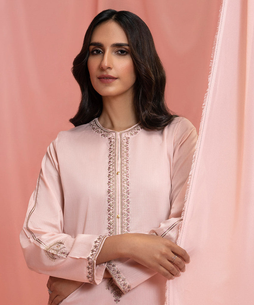 Exude grace in this peach straight silhouette featuring intricate embroidery.