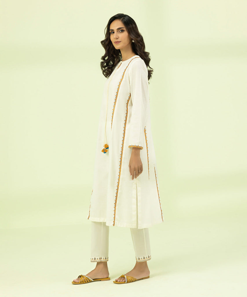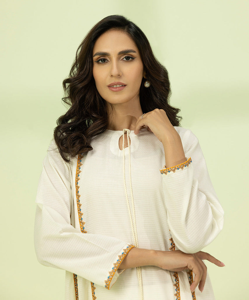 Plain Front With Embroidery, Embroidered Back With Panels, Full Sleeves With Embroidered Borders, Round Neckline With Keyhole