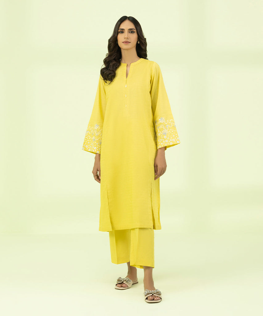 Plain Front, Plain Back With Embroidery, Full Sleeves With Embroidered Borders, Band Neckline With Slit