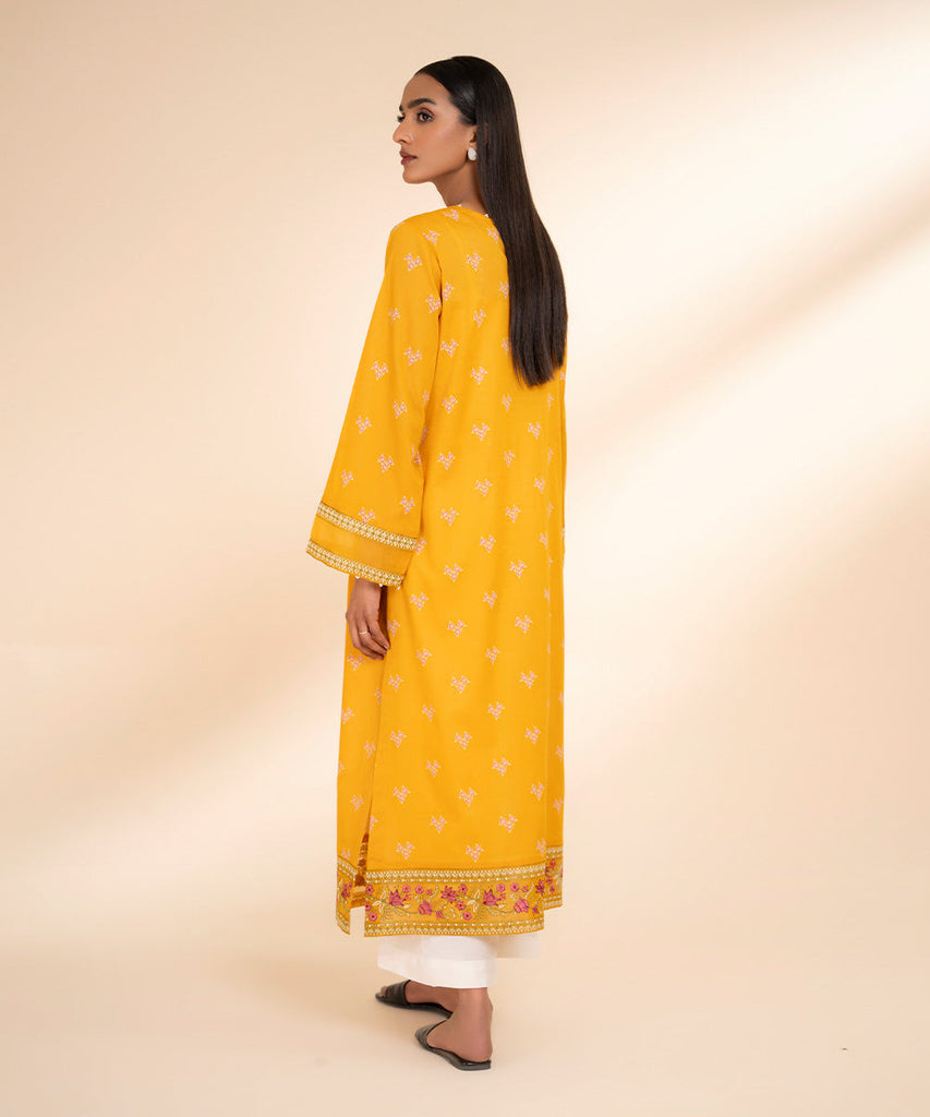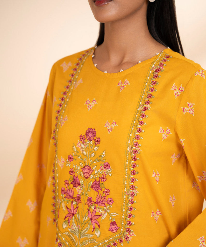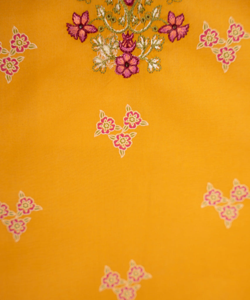Elevate your summer style with our embroidered A line bright mustard shirt featuring a round neckline.