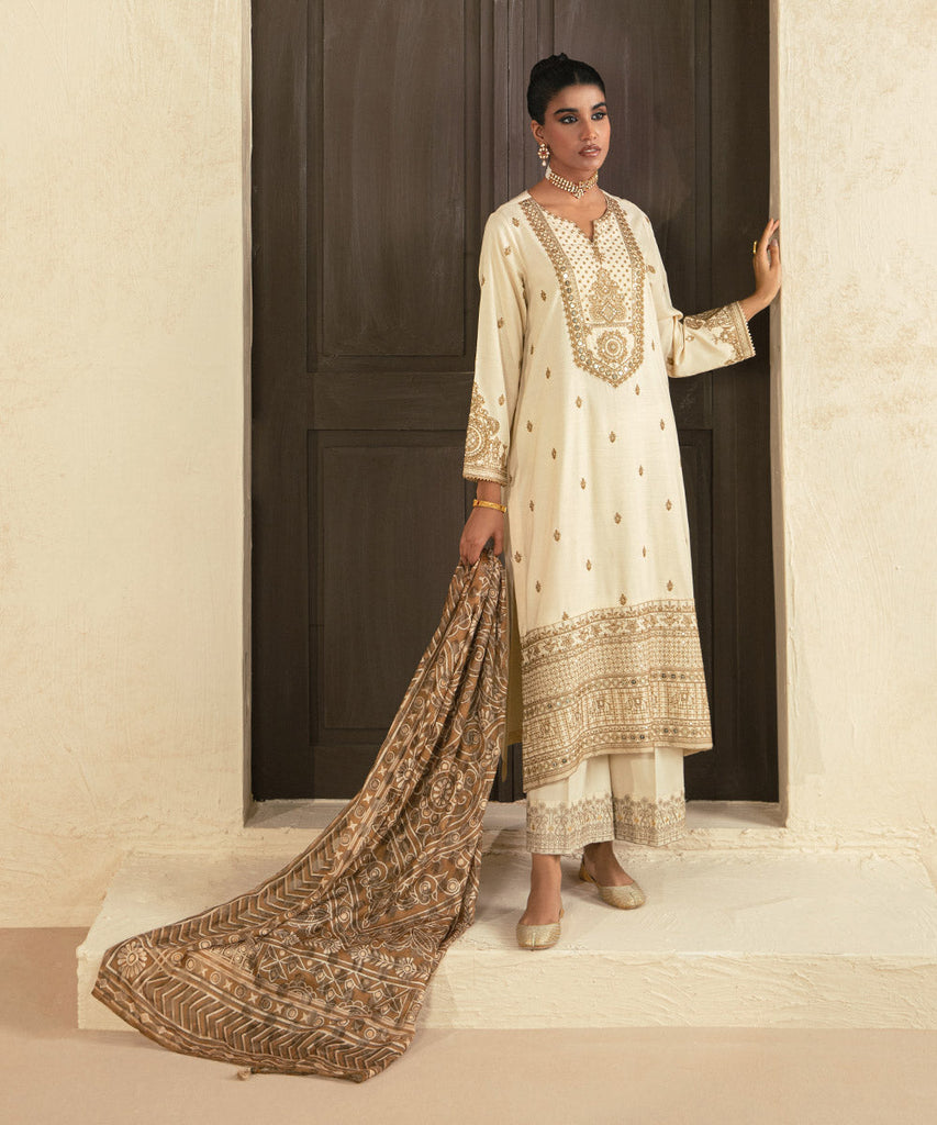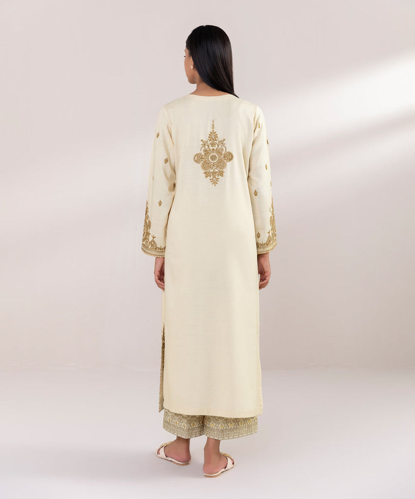 Curate the perfect Eid look with our beige Dull raw silk embroidered A-line shirt featuring a round neckline with slit.