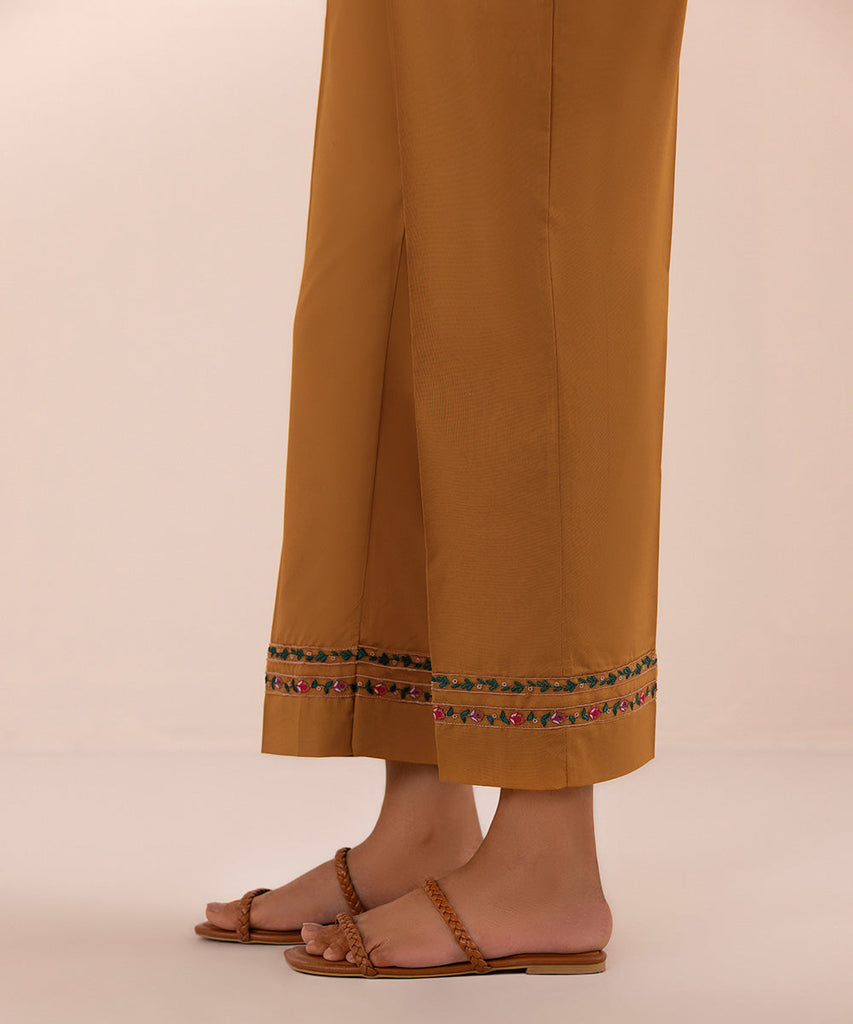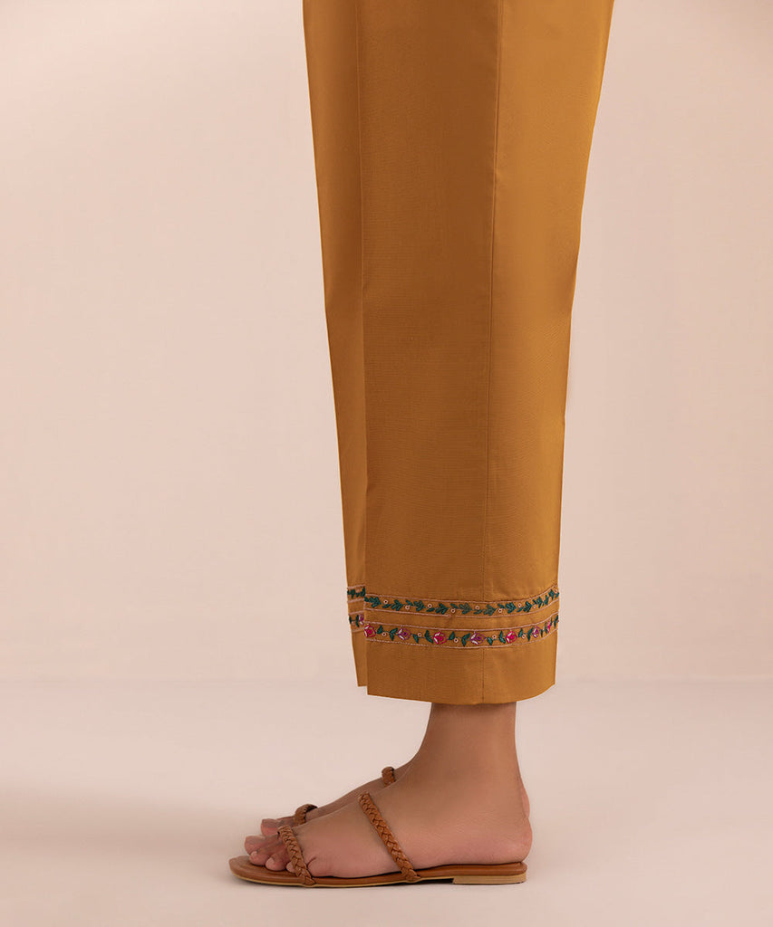 Complete your outfit with our burnt mustard embroidered straight cambric pants.