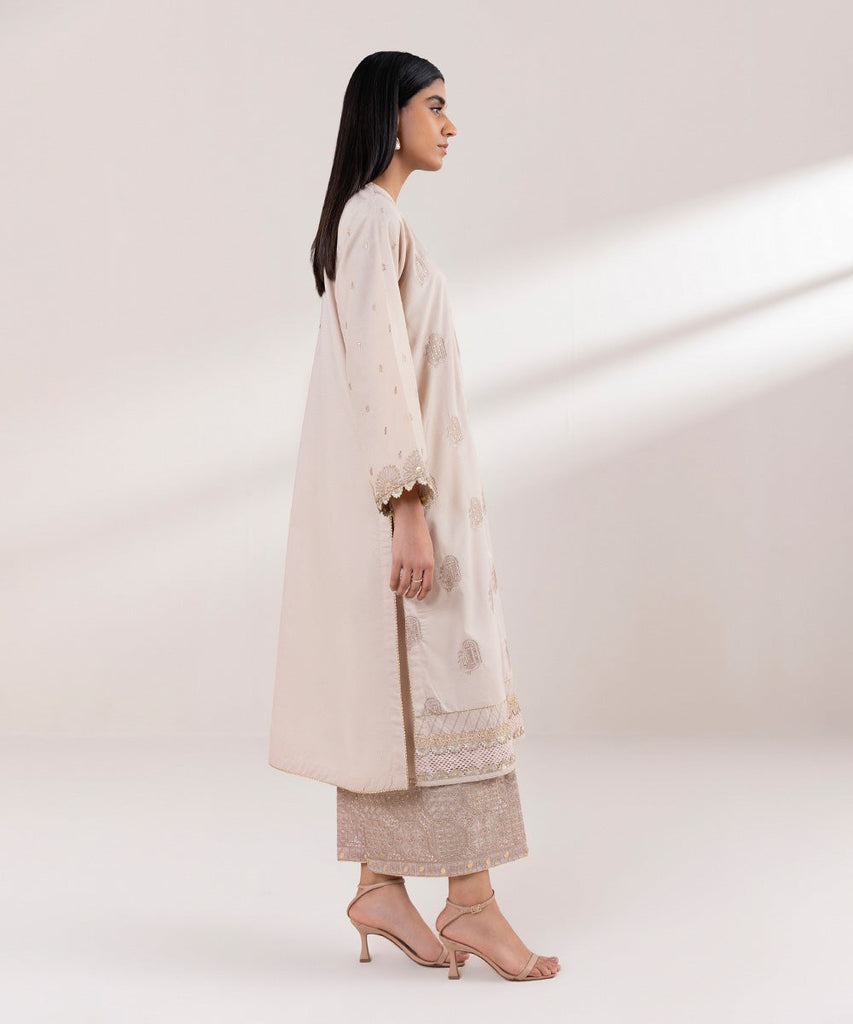 Curate the perfect Eid look with our embroidered tan brown zari lawn shirt featuring a round neckline with slit.