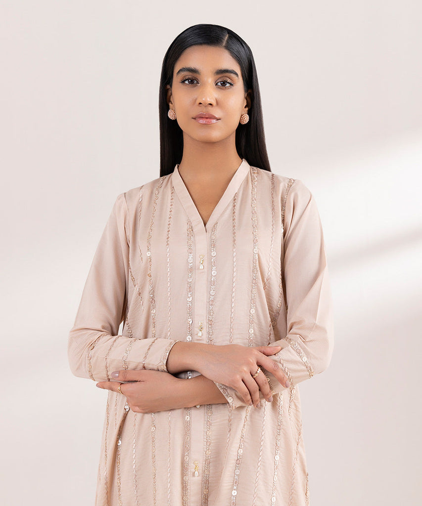 A-Line Shirt With Bottom SlitImmerse yourself in festive elegance with our light brown embroidered zari lawn A-line s...